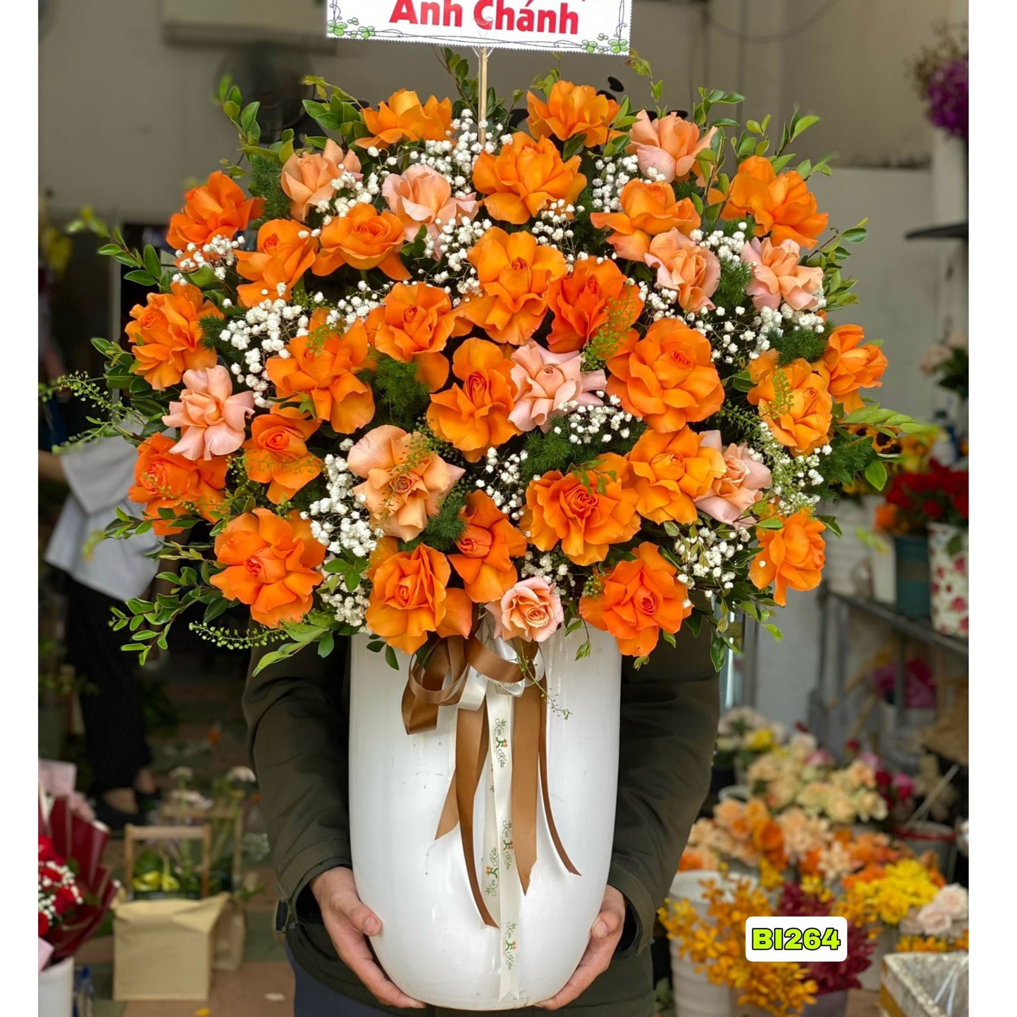 Mẫu BI264 gồm các loại hoa: + 10 hồng shimmer lận cánh + 26 hồng cam quốc vương lận cánh + và các hoa, lá phụ khác - Liên hệ KIM KIỀU FLOWER để tư vấn thiết kế mẫu hoa theo yêu cầu bạn nhé!