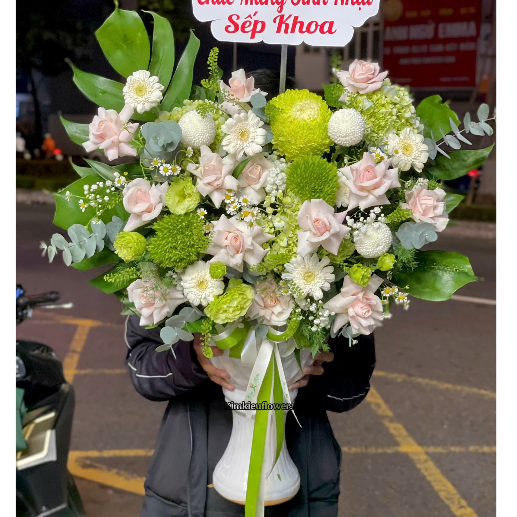 Mẫu BI370 gồm các loại hoa: + 13 hồng kem + 3 cẩm tú cầu + 6 đồng tiền nhí + 3 cúc pingpong + 4 cát tường xanh + 2 greenwich + và các lá phụ khác - Liên hệ KIM KIỀU FLOWER để tư vấn thiết kế mẫu hoa theo yêu cầu bạn nhé!