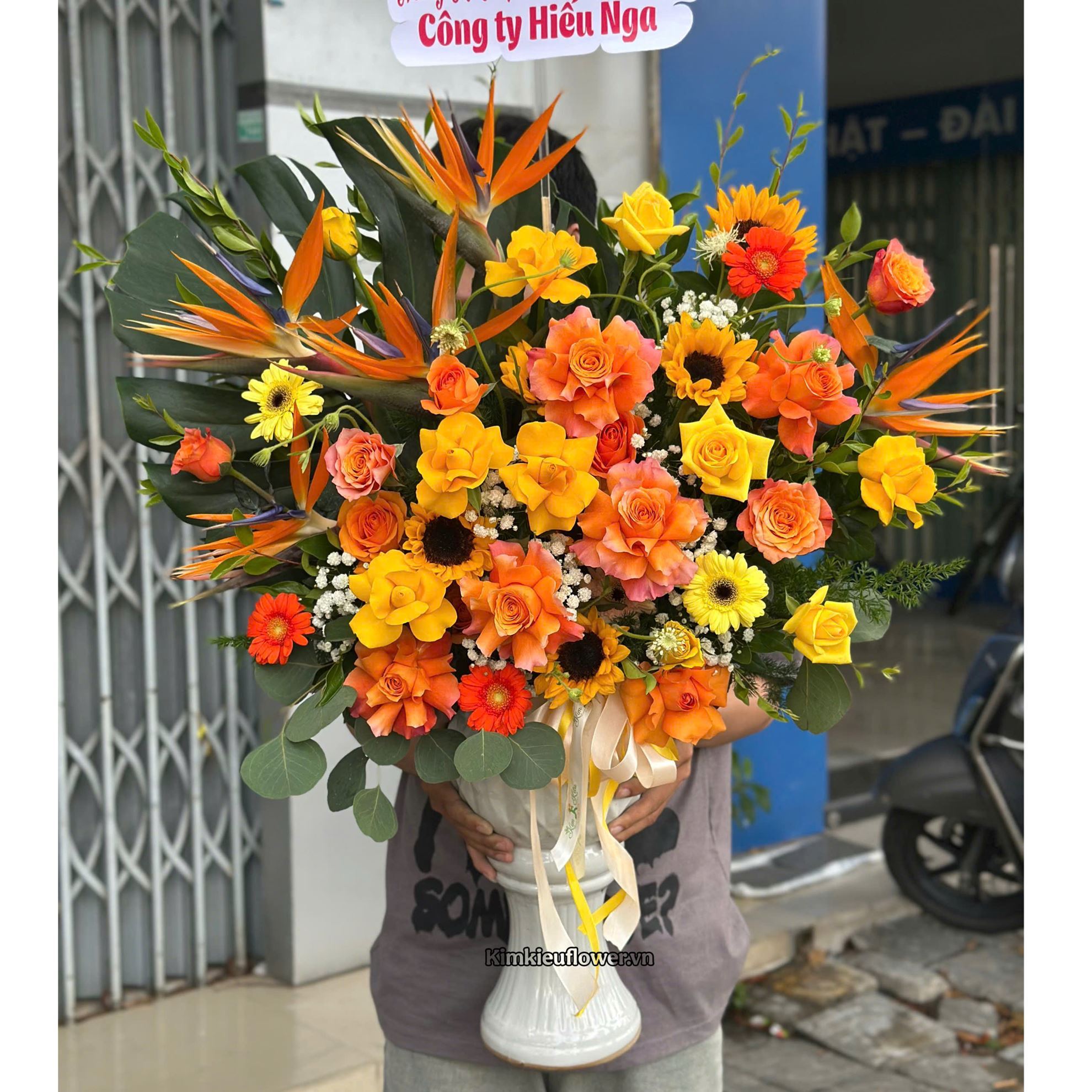 Bình hoa chúc mừng tone vàng cam mix thiên điểu - BI339