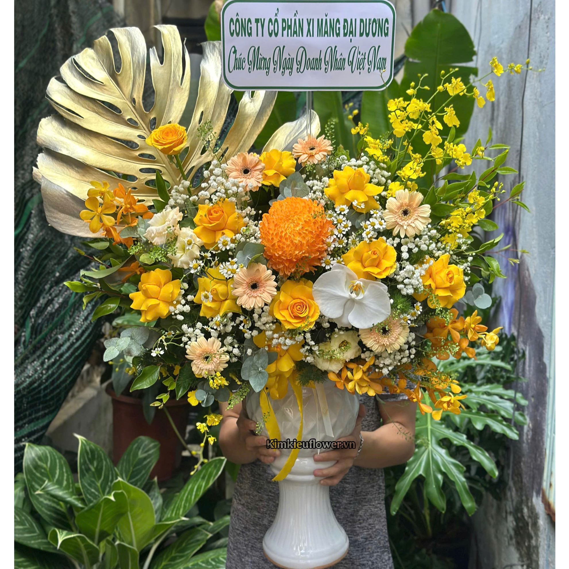 Bình hoa chúc mừng tone vàng mix lan hồ điệp - BI367