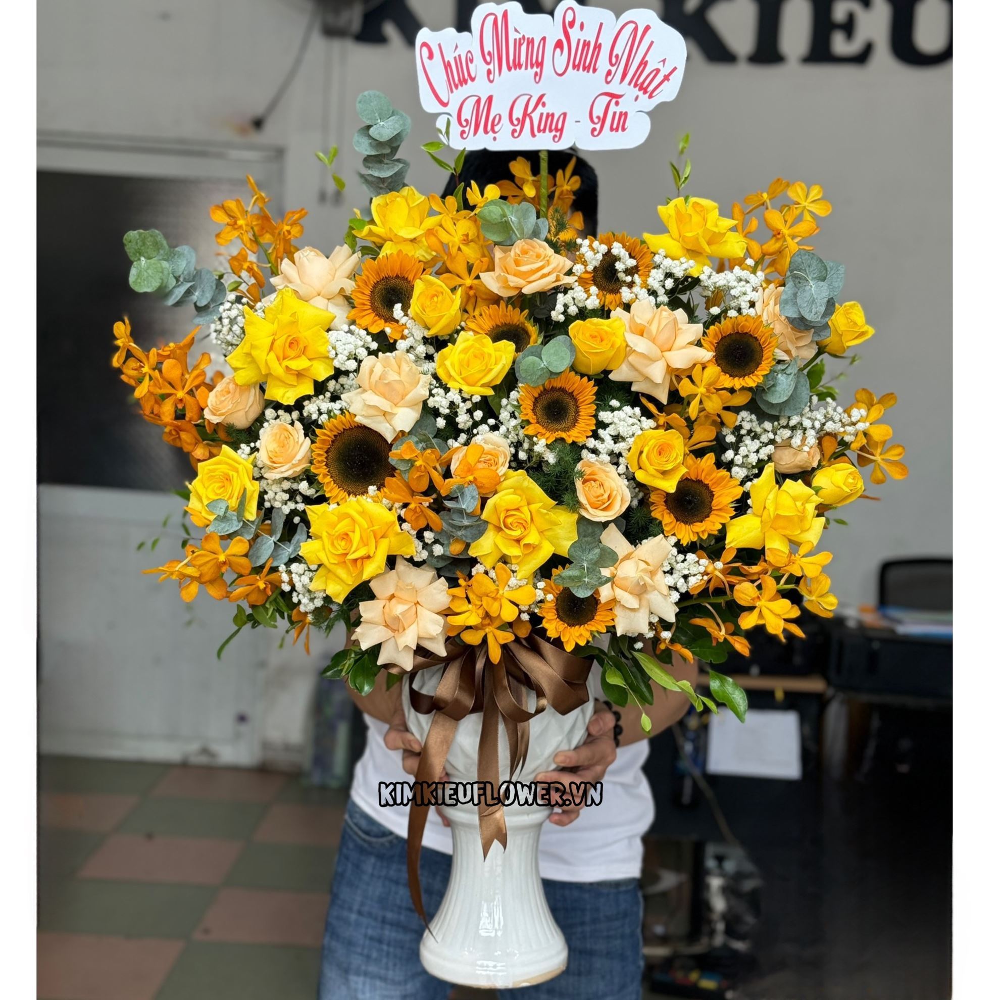 Mẫu BI292 gồm các loại hoa: + 13 hoa hồng vàng (6 lận cánh, 7 không lận cánh) + 8 hoa hướng dương + 11 lan vàng mokara + 12 hoa hồng mỡ gà(5 lận cánh, 7 không lận) + và các hoa, lá phụ khác - Liên hệ KIM KIỀU FLOWER để tư vấn thiết kế mẫu hoa theo yêu cầu bạn nhé!