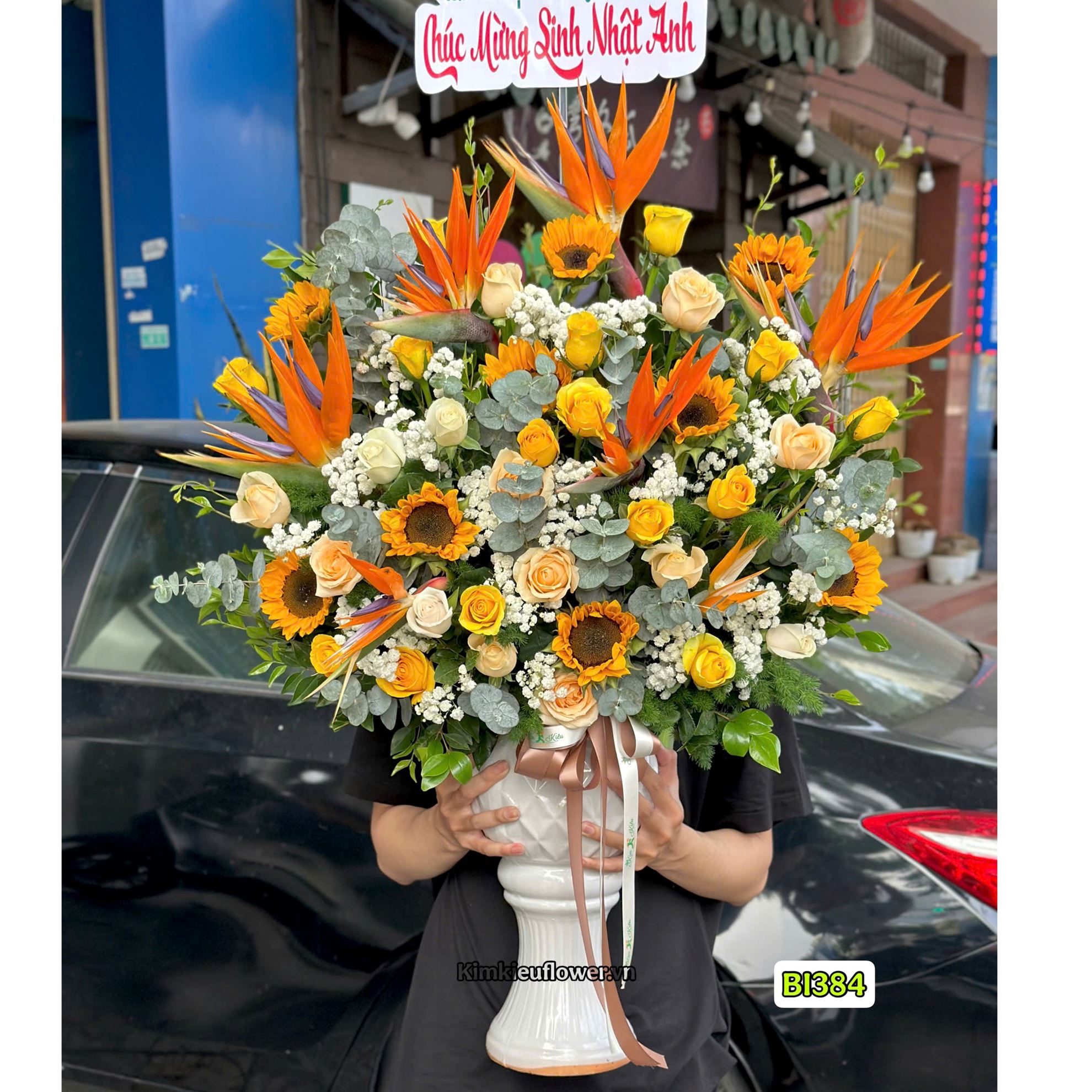 Bình hoa chúc mừng tone vàng mix thiên điểu - BI384