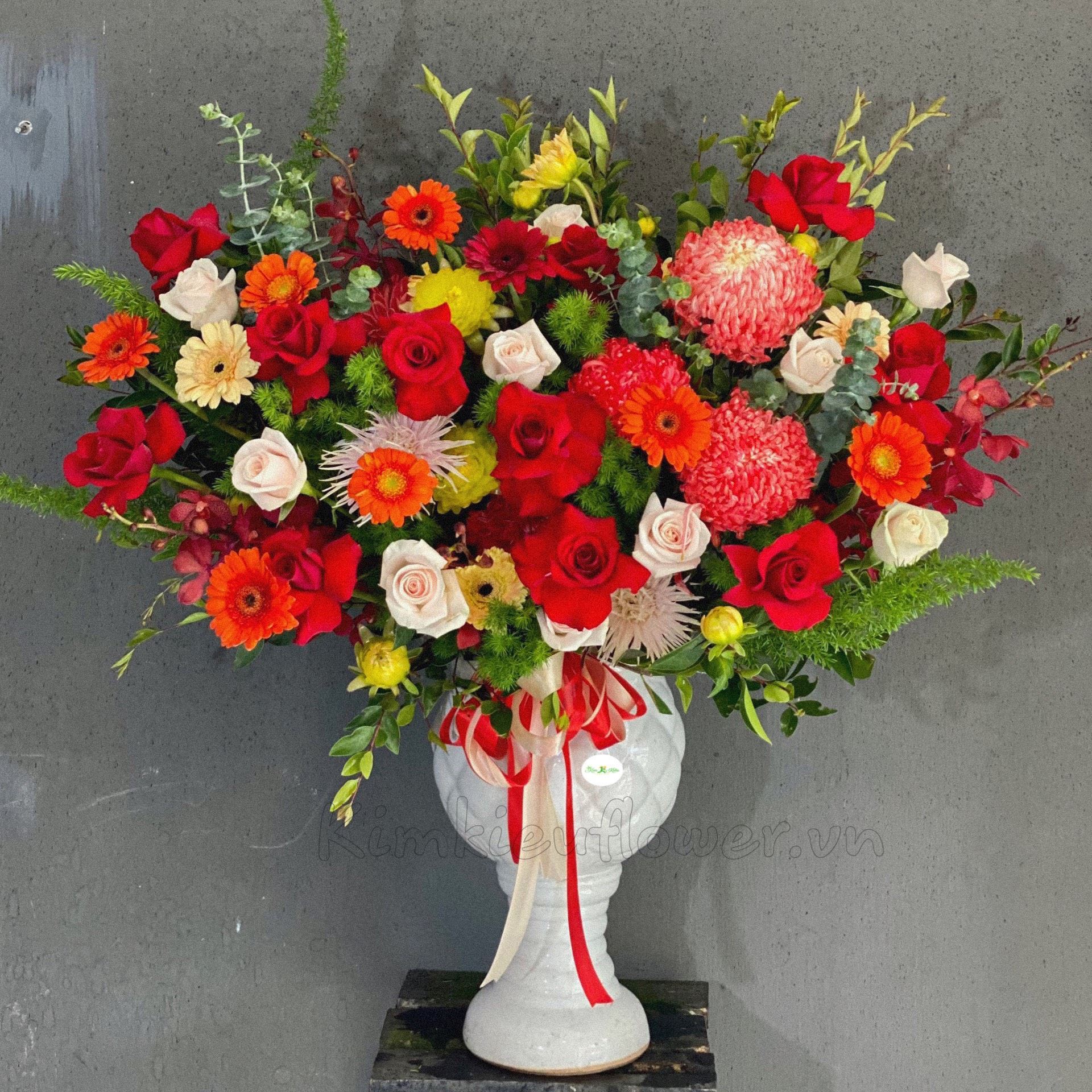 Mẫu BI92 gồm các loại hoa: + hoa hồng đỏ + đồng tiền nhí + 3 cúc mẫu đơn đỏ + hoa hồng kem + hoa lan đỏ + và các hoa,lá phụ khác- Liên hệ KIM KIỀU FLOWER để tư vấn thiết kế mẫu hoa theo yêu cầu bạn nhé!