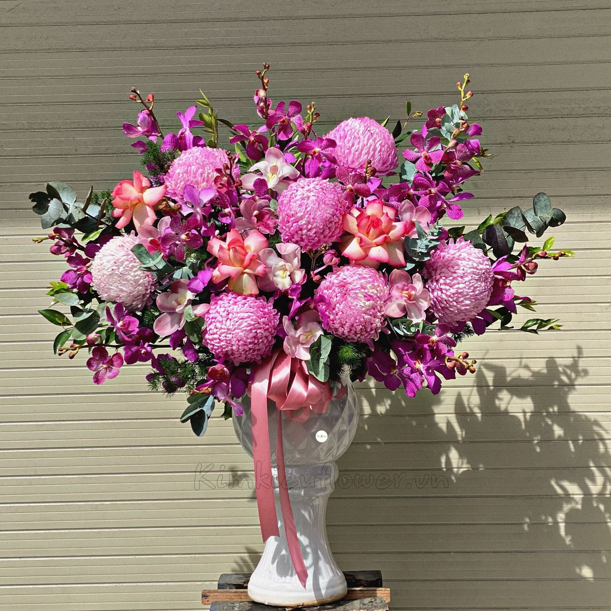 Mẫu BI166 gồm các loại hoa: + cúc mẫu đơn hồng + hồng đại hỷ + lan tím + và các lá phụ khác - Liên hệ KIM KIỀU FLOWER để tư vấn thiết kế mẫu hoa theo yêu cầu bạn nhé!