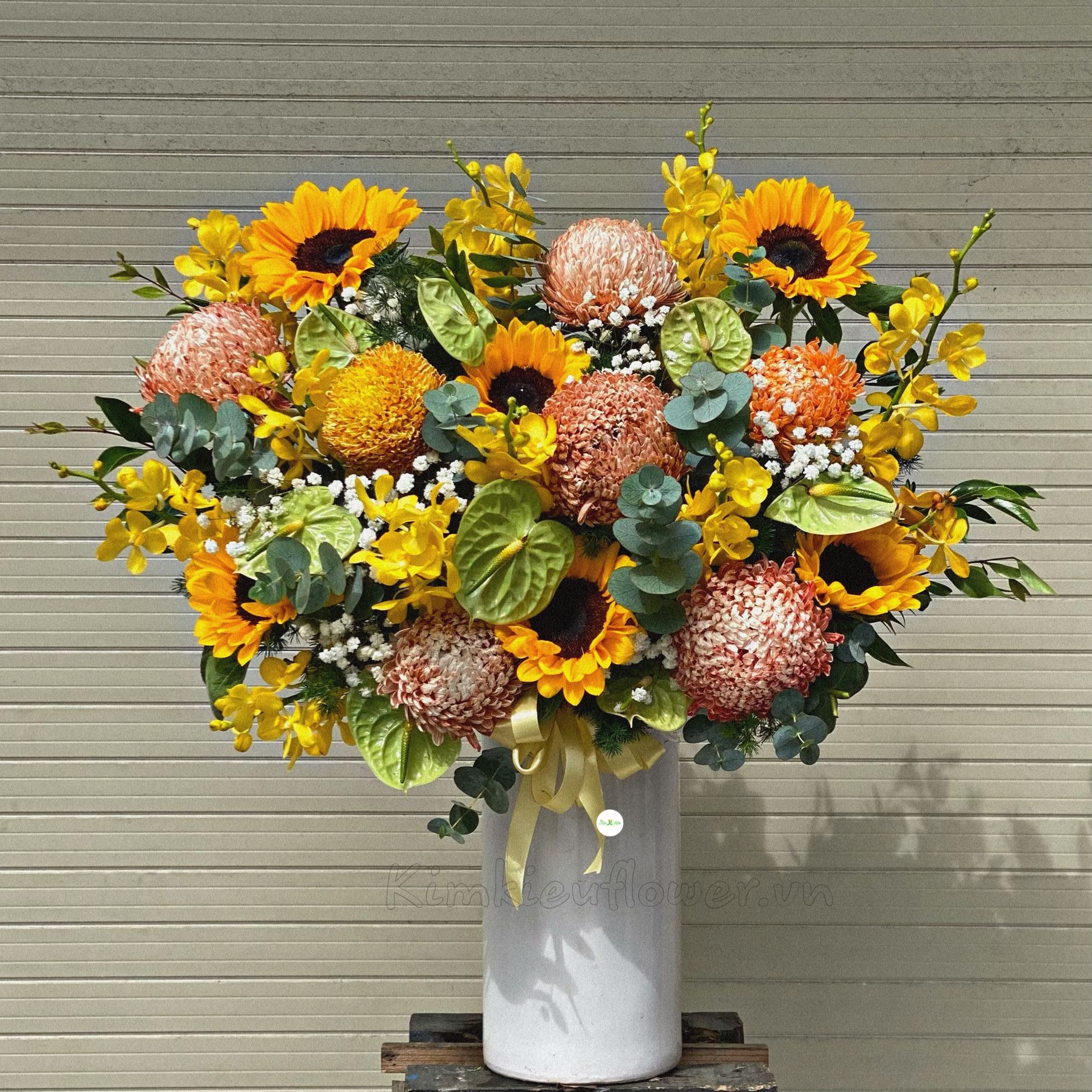 Mẫu BI165 gồm các loại hoa: + cúc mẫu đơn + hướng dương + lan vàng + hồng môn xanh + và các lá phụ khác - Liên hệ KIM KIỀU FLOWER để tư vấn thiết kế mẫu hoa theo yêu cầu bạn nhé!