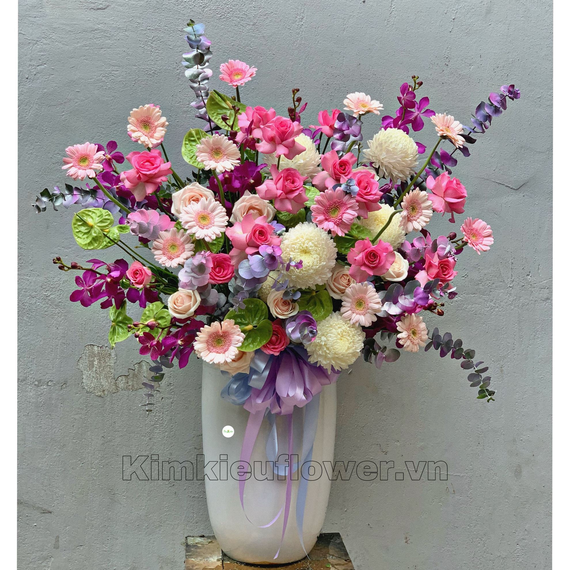 Mẫu BI186 gồm các loại hoa: + hoa cúc mẫu đơn trắng hàng nhập khẩu Malaysia + hoa hồng sen + hoa hồng + đồng tiền nhí + lan tím + và các lá phụ khác - Liên hệ KIM KIỀU FLOWER để tư vấn thiết kế mẫu hoa theo yêu cầu bạn nhé!