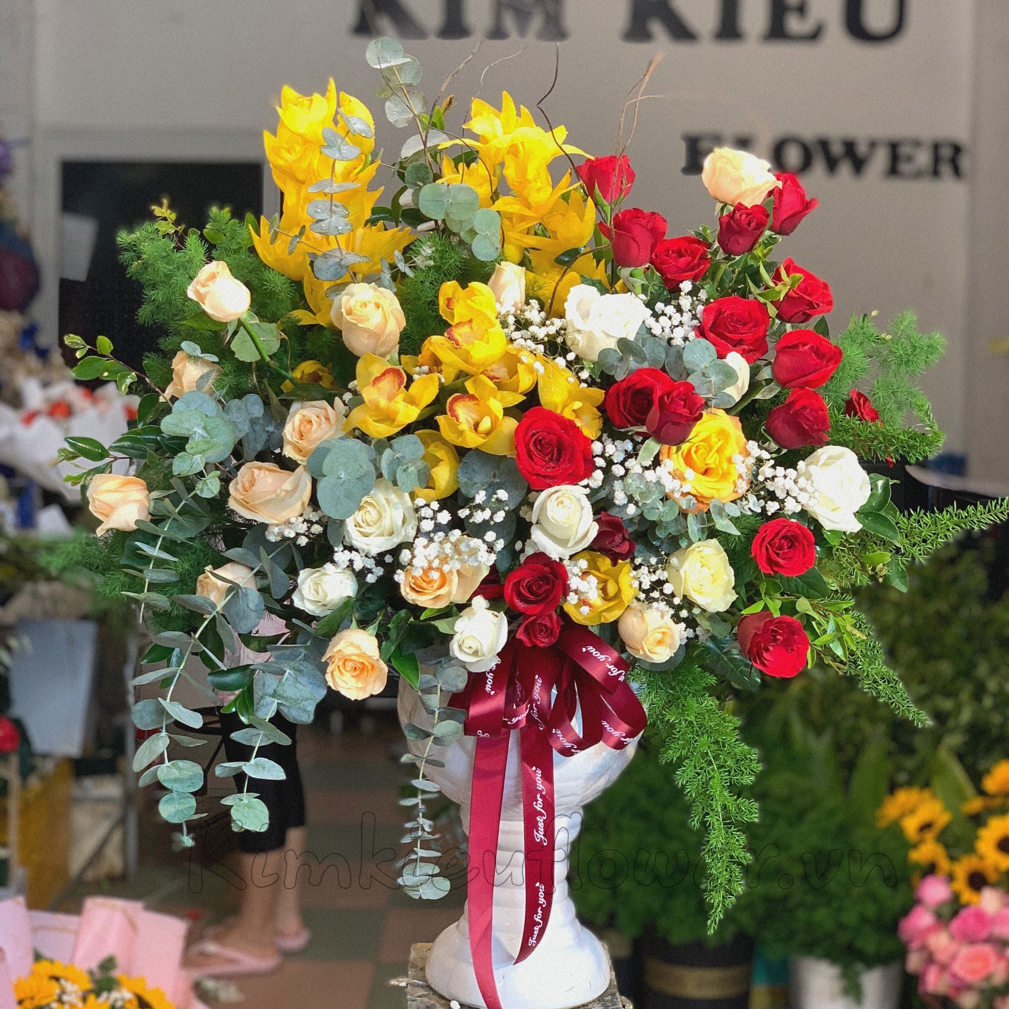 Mẫu BI54 gồm các loại hoa: + hoa hồng đỏ + hoa hồng mỡ gà + địa lan + và các hoa,lá phụ khác - Liên hệ KIM KIỀU FLOWER để tư vấn thiết kế mẫu hoa theo yêu cầu bạn nhé!