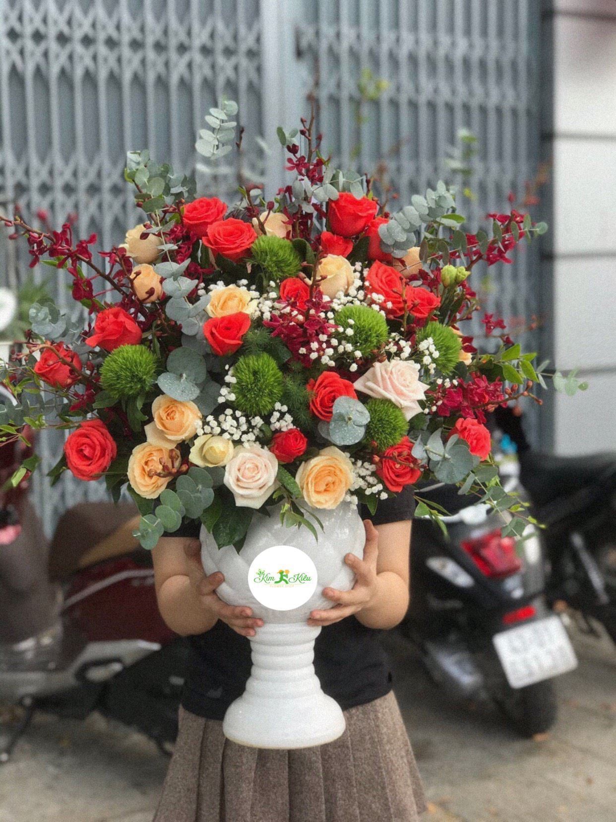 Mẫu BI06: Sắc cam đỏ kết hợp cùng màu xanh mát rượi luôn mang lại một cảm giác bình yên, trong trẻo đến lạ. Bình hoa sẽ mang đến cho người nhận lời chúc an lành, bình yên trong tâm hồn và nhiều niềm vui trong cuộc sống. - Mẫu BI06 gồm các loại hoa: + Green wicky + hồng cam đỏ + hồng mỡ gà + lan nhện đỏ + và các hoa,lá phụ khác - Liên hệ KIM KIỀU FLOWER để tư vấn thiết kế mẫu hoa theo yêu cầu bạn nhé!