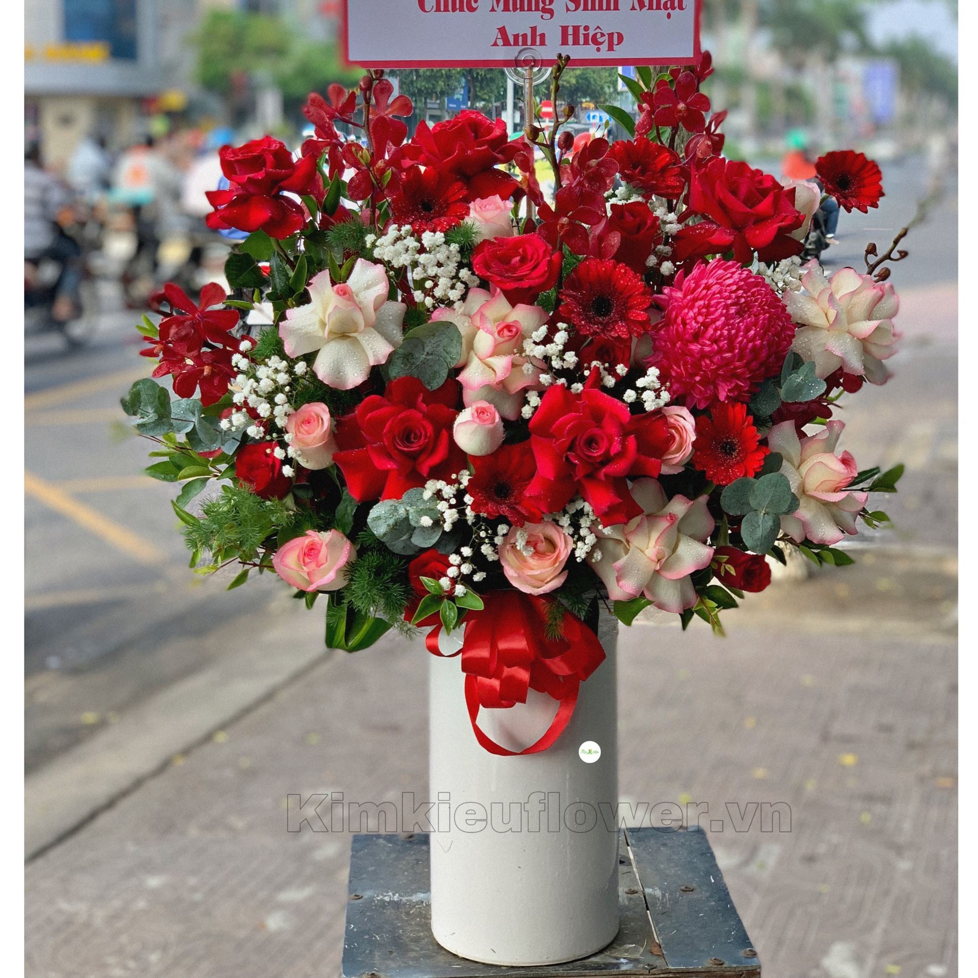 Mẫu BI169 gồm các loại hoa: + hoa hồng đỏ + hoa hồng hỷ trứng + cúc mẫu đơn + đồng tiền đỏ + lan đỏ + và các lá phụ khác - Liên hệ KIM KIỀU FLOWER để tư vấn thiết kế mẫu hoa theo yêu cầu bạn nhé!