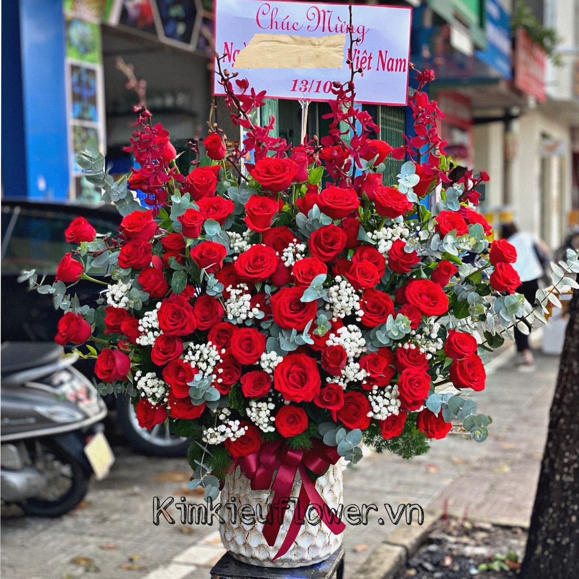 Mẫu BI222 gồm các loại hoa: + hoa hồng đỏ + lan đỏ + và các lá phụ khác - Liên hệ KIM KIỀU FLOWER để tư vấn thiết kế mẫu hoa theo yêu cầu bạn nhé!