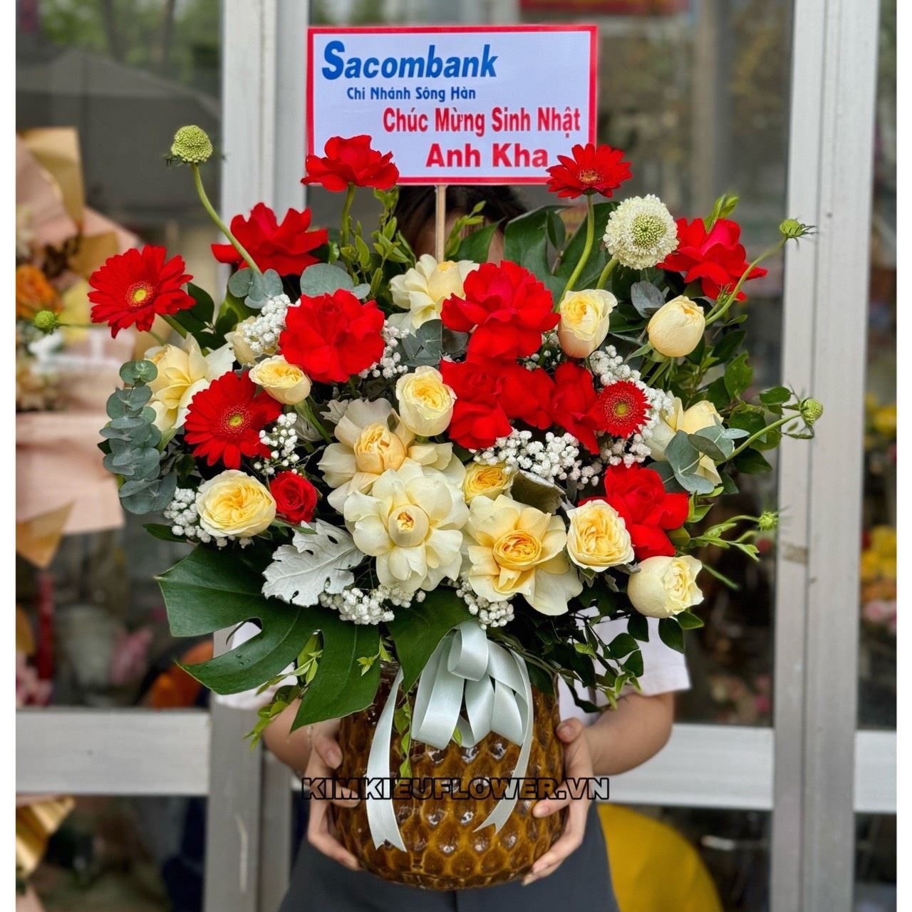 Bình hoa BI285 gồm: + 9 Hoa hồng đỏ + 15 Hoa hồng victo vàng (8 không lận, 7 lận cánh) + 4 đồng tiền đỏ + và các hoa, lá phụ khác - Liên hệ KIM KIỀU FLOWER để tư vấn thiết kế mẫu hoa theo yêu cầu bạn nhé!