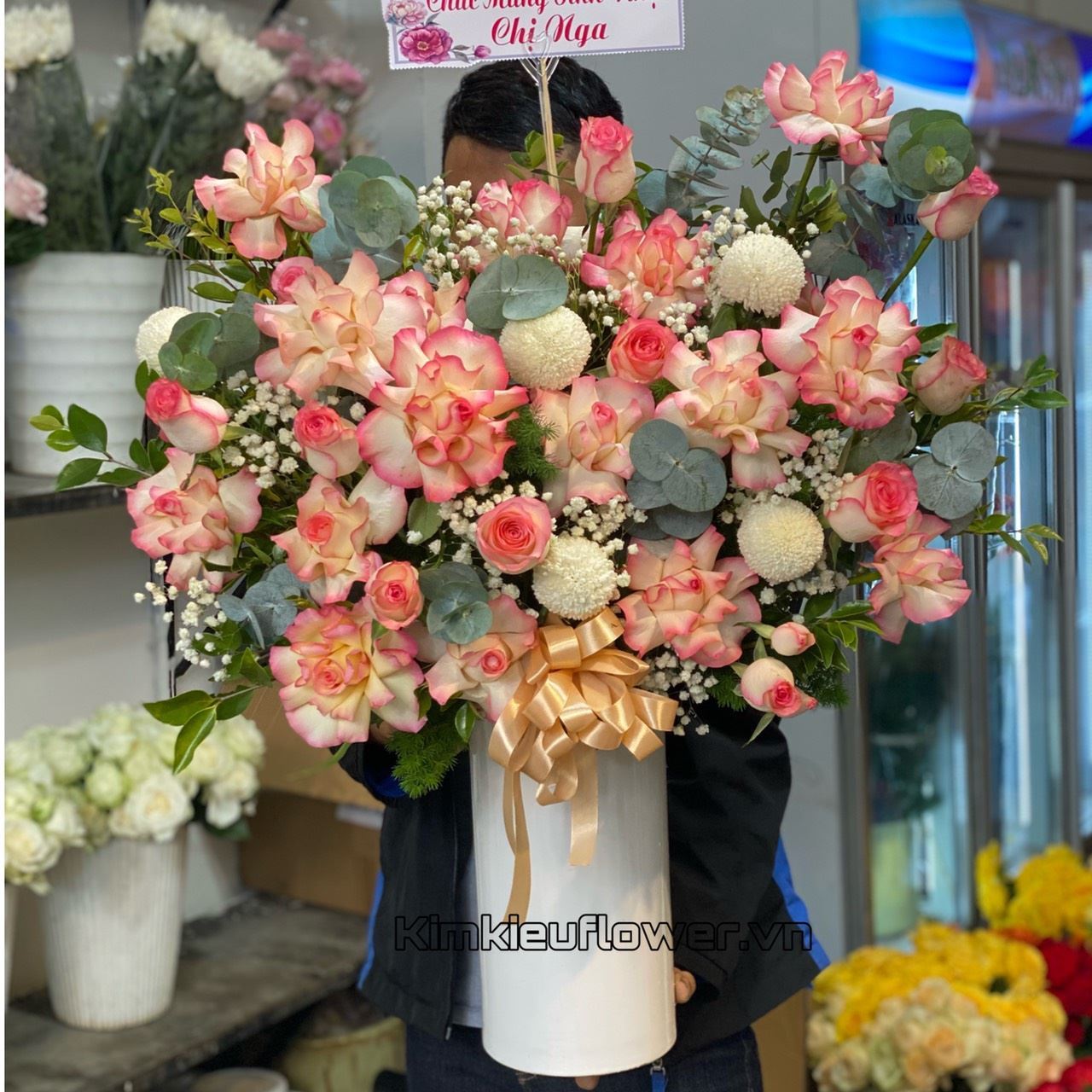 Mẫu BI233 gồm các loại hoa: + hoa hồng hỷ trứng + cúc pingpong trắng + và các lá phụ khác - Liên hệ KIM KIỀU FLOWER để tư vấn thiết kế mẫu hoa theo yêu cầu bạn nhé!