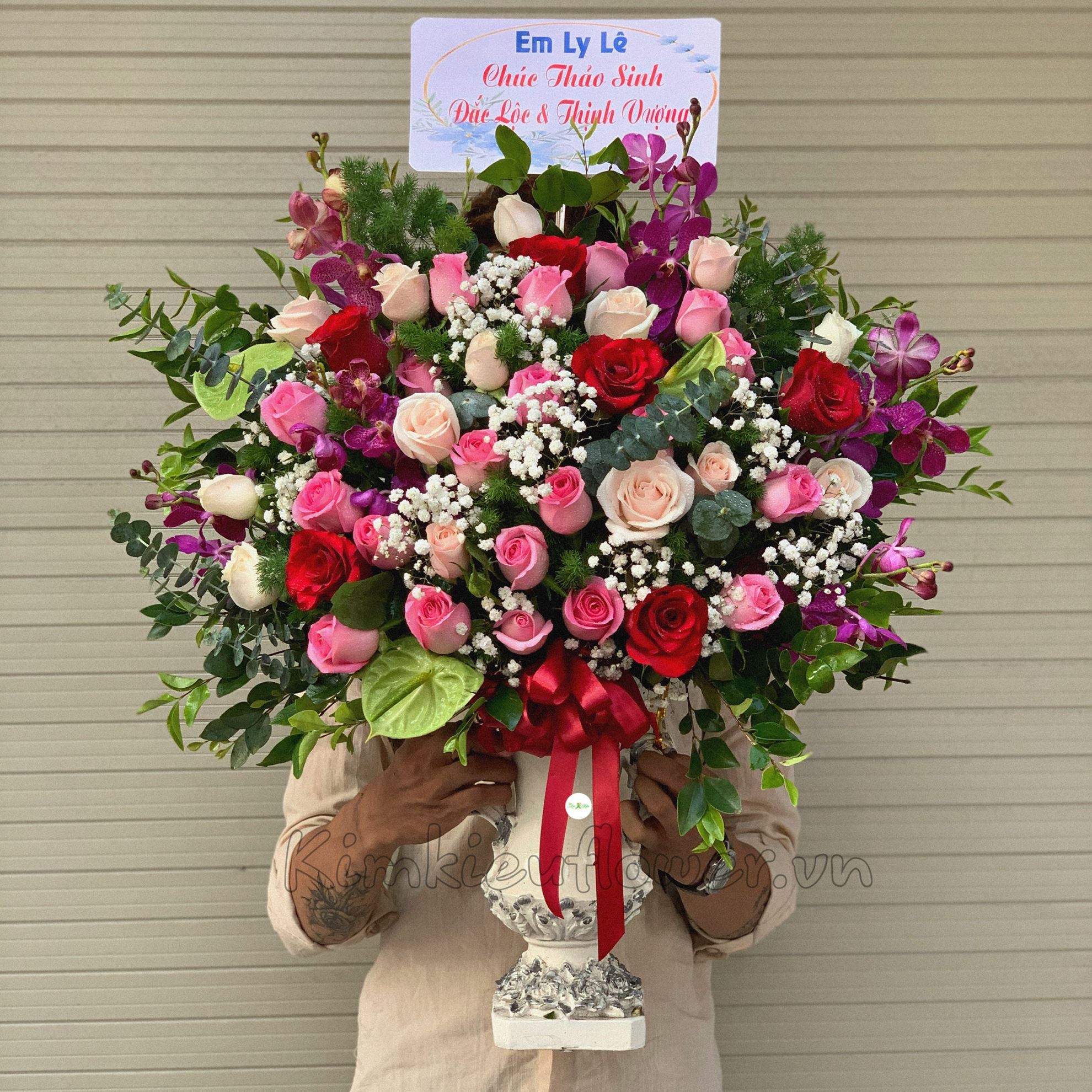 Mẫu BI100 gồm các phụ kiện và các loại hoa: + 1 bình composite + lan tím + hoa hồng kem + hoa hồng dâu + hoa hồng đỏ + huyết môn xanh + và các hoa,lá phụ khác- Liên hệ KIM KIỀU FLOWER để tư vấn thiết kế mẫu hoa theo yêu cầu bạn nhé!