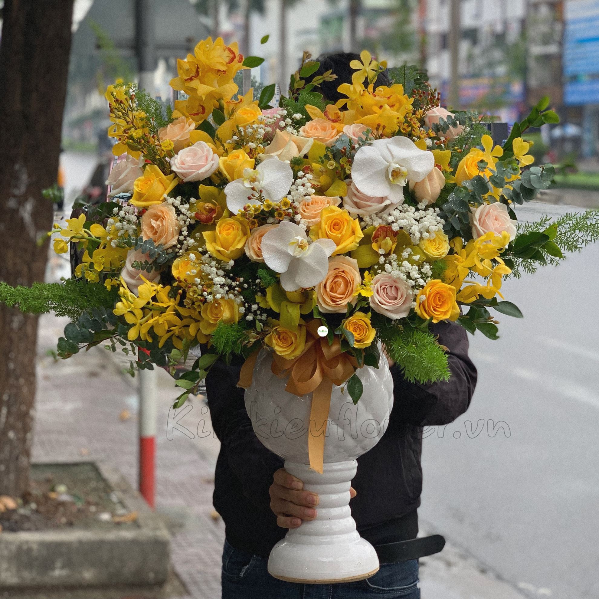 Mẫu BI67: Gồm các loại hoa: + hoa hồng vàng + hoa hồng kem + hoa hồng mỡ gà + địa lan + lan hồ điệp + lan vàng mokara + và các hoa,lá phụ khác - Liên hệ KIM KIỀU FLOWER để tư vấn thiết kế mẫu hoa theo yêu cầu bạn nhé!