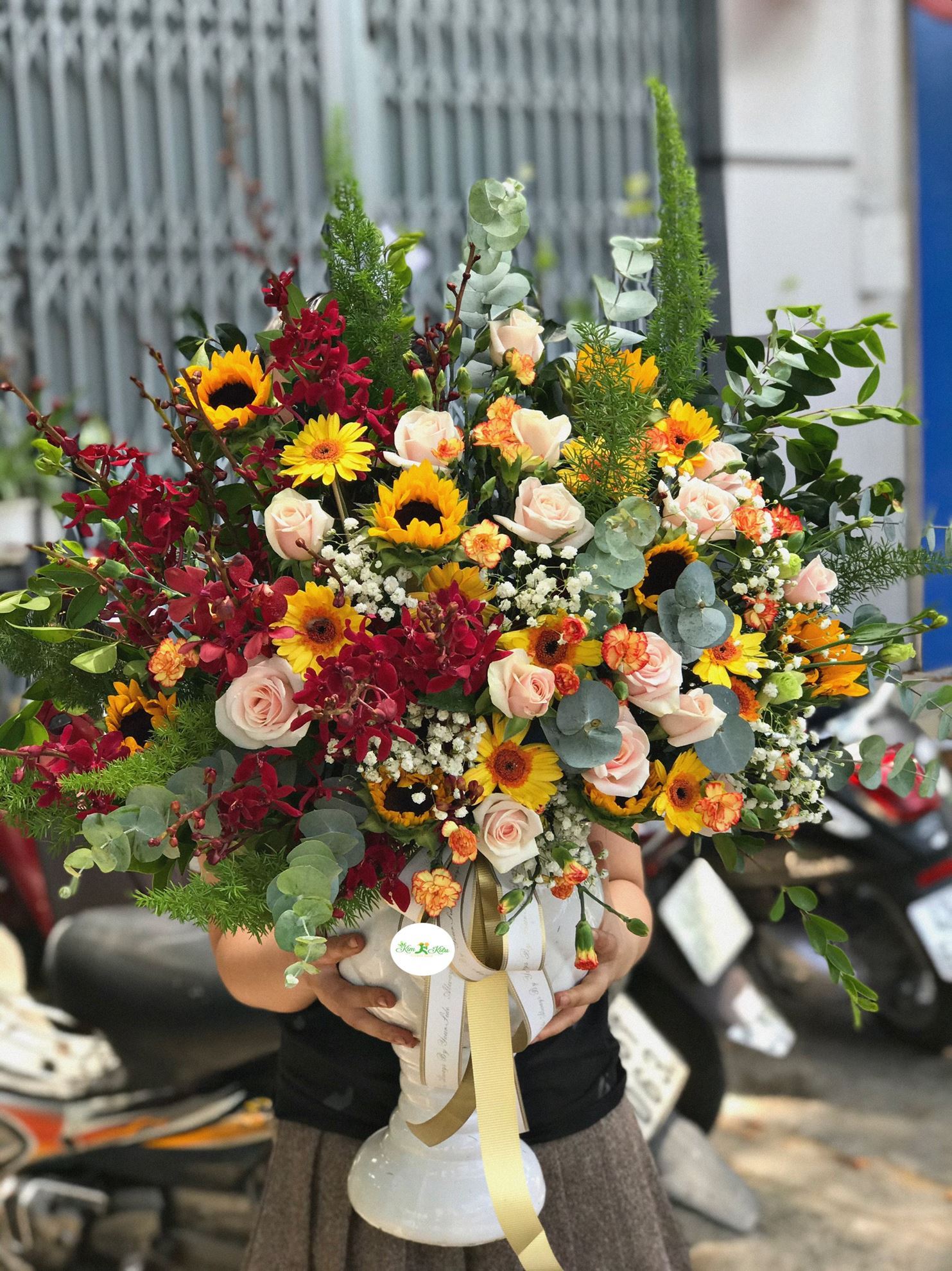 Mẫu BI20: mang sắc vàng ấm áp của hoa Hướng Dương tạo cảm giác tươi vui và mang lại năng lượng tích cực cho người nhận Bình hoa thích hợp để tặng vào các ngày chúc mừng như sinh nhật, Khai Trương, dịp lên chức hay chỉ là để động viên bạn bè và người thân trong giai đoạn khó khăn của họ với thông điệp về sự kiên cường và luôn hướng về những điều tốt đẹp. - Mẫu BI20 gồm các loại hoa: + hoa hướng dương + hoa hồng kem + hoa đồng tiền + hoa cẩm chướng + lan nhện đỏ + và các hoa,lá phụ khác - Liên hệ KIM KIỀU FLOWER để tư vấn thiết kế mẫu hoa theo yêu cầu bạn nhé!