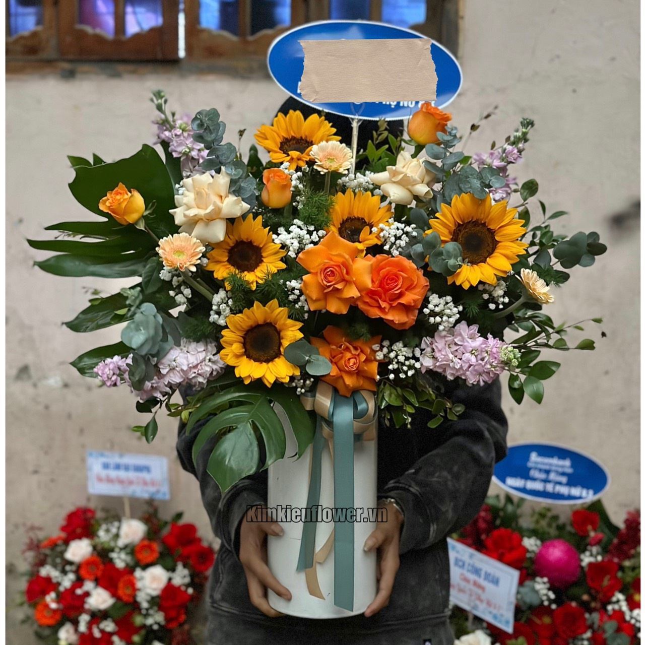 Mẫu BI234 gồm các loại hoa: + hoa hướng dương + hoa hồng cam + hoa phi yến tím + hoa mỡ gà + đồng tiền nhí + và các lá phụ khác - Liên hệ KIM KIỀU FLOWER để tư vấn thiết kế mẫu hoa theo yêu cầu bạn nhé!