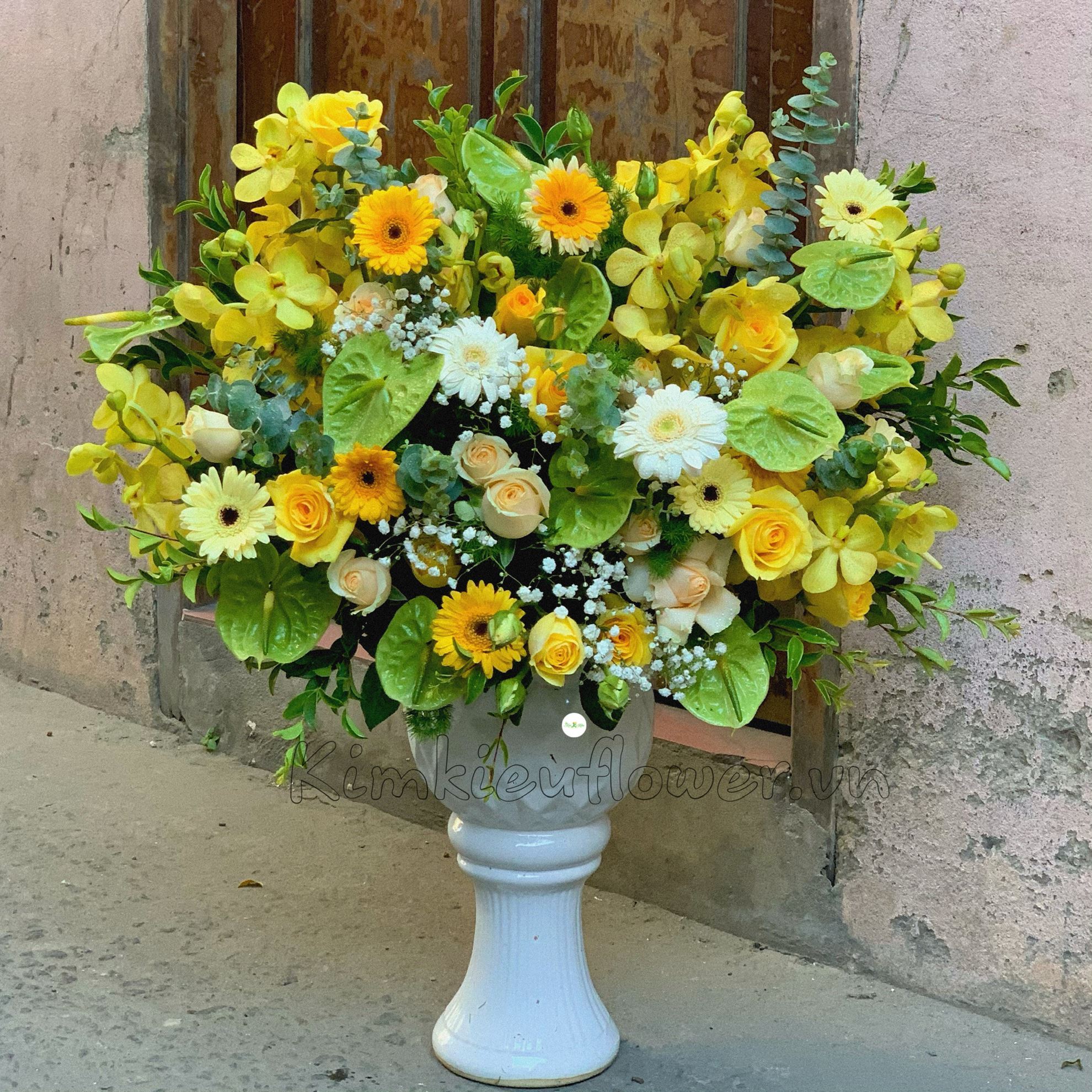 Mẫu BI103 gồm các loại hoa: + huyết môn xanh + hoa hồng vàng + lan vàng mokara + đồng tiền nhí + hồng mỡ gà + và các hoa,lá phụ khác- Liên hệ KIM KIỀU FLOWER để tư vấn thiết kế mẫu hoa theo yêu cầu bạn nhé!