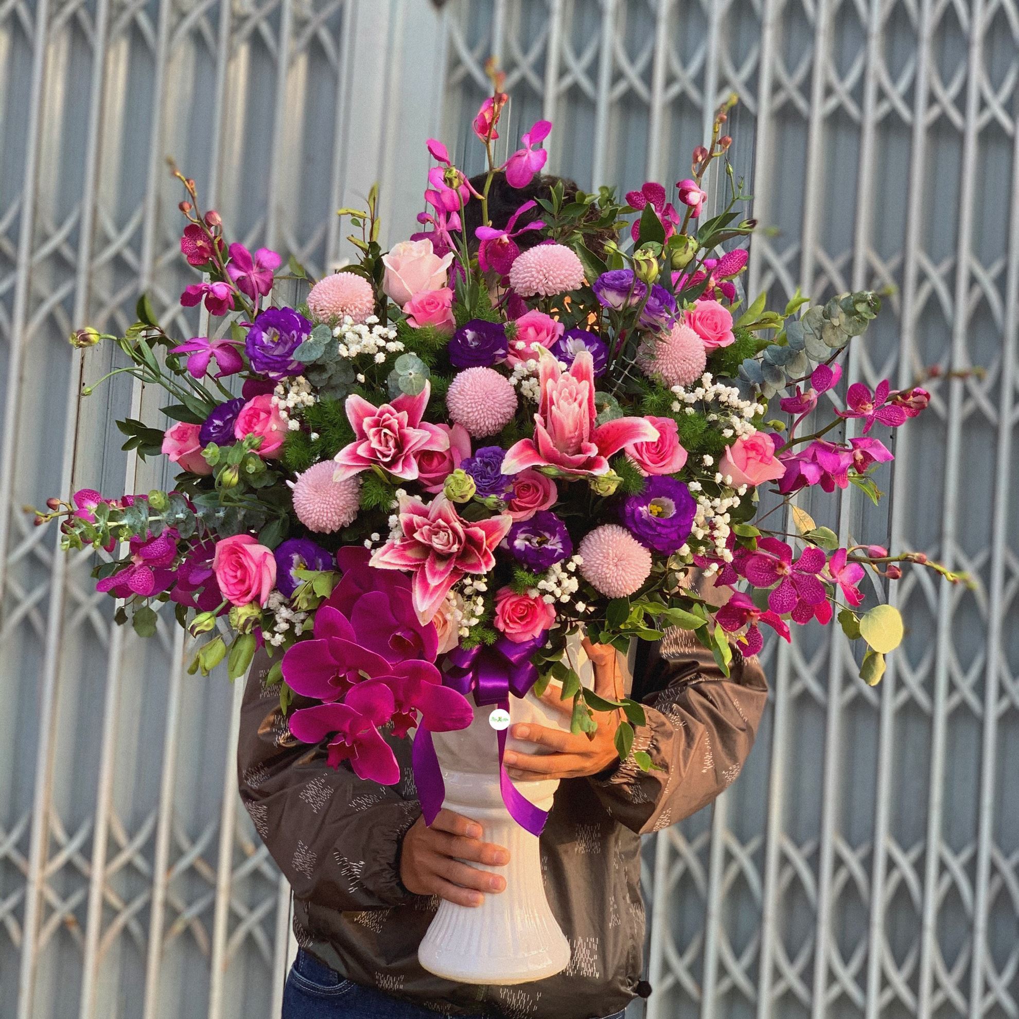 Mẫu BI89 gồm các loại hoa: + hoa lan hồ điệp tím + hoa ly kép + pingpong tím + cát tường tím + hoa hồng dâu + lan tím + và các hoa,lá phụ khác- Liên hệ KIM KIỀU FLOWER để tư vấn thiết kế mẫu hoa theo yêu cầu bạn nhé!