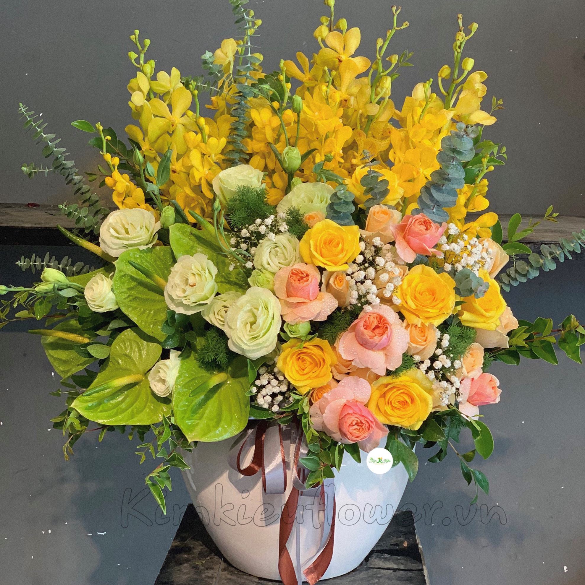 Mẫu BI41 gồm các loại hoa; + hoa hồng nhập juliet cam + hoa hồng vàng + lan vàng mokara + huyết môn xanh + cát tường xanh + và các hoa,lá phụ khác - Liên hệ KIM KIỀU FLOWER để tư vấn thiết kế mẫu hoa theo yêu cầu bạn nhé!