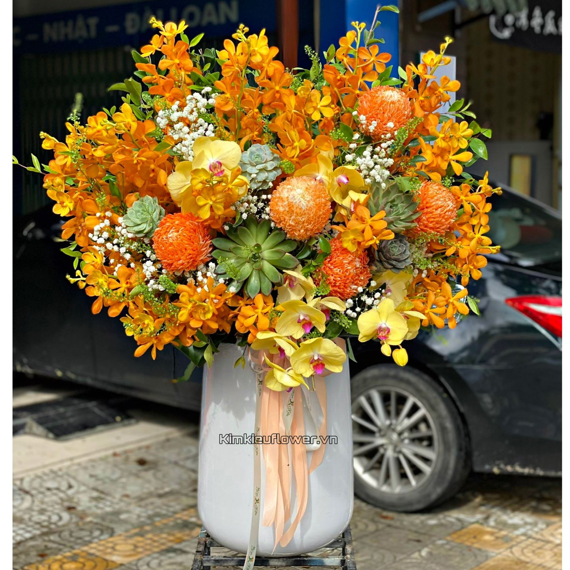 Bình hoa lan vàng, cúc mẫu đơn mix sen đá - BI266