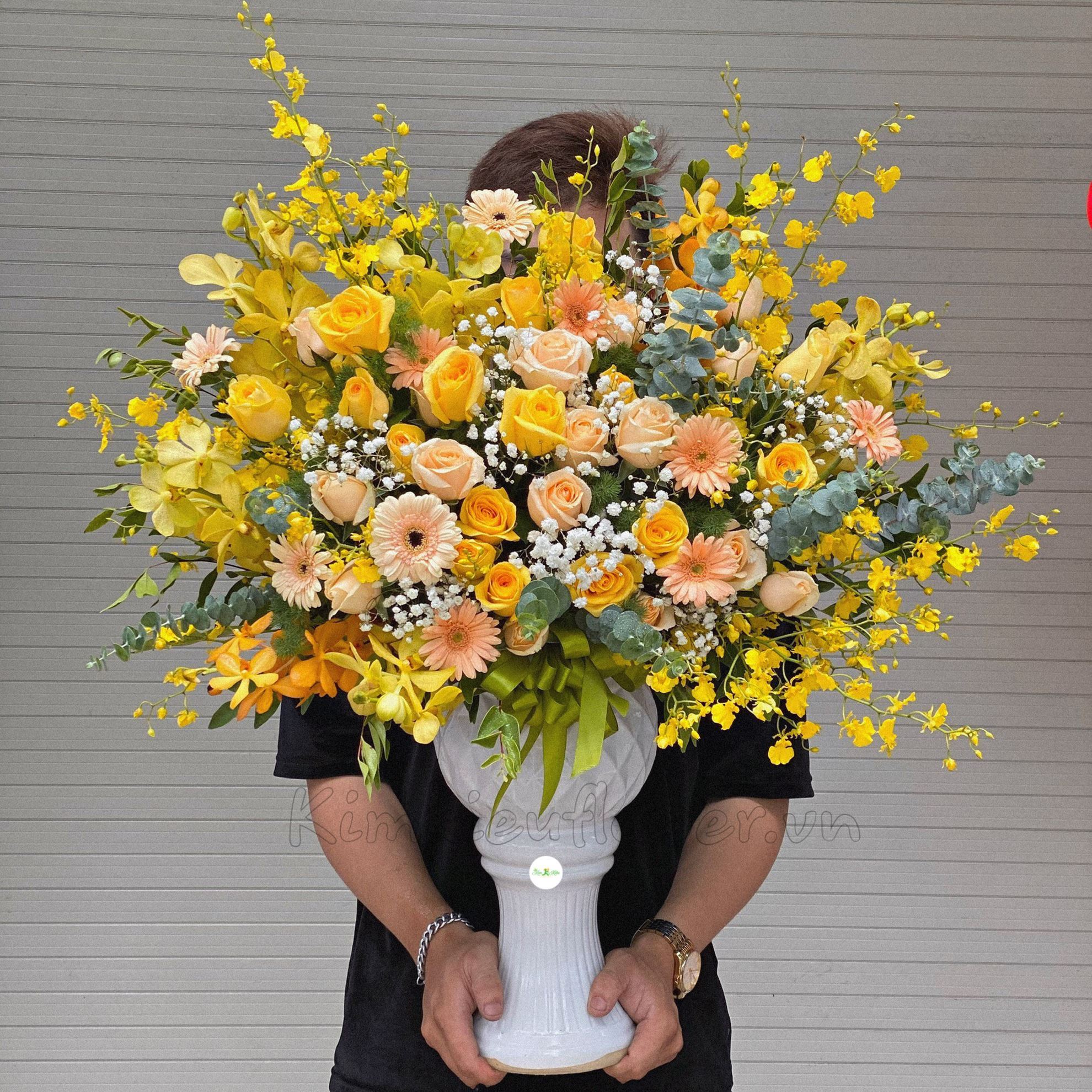 Mẫu BI114 gồm các loại hoa: + hoa hồng vàng + hoa lan vũ nữ + lan vàng + hoa hồng mỡ gà + đồng tiền nhí + và các lá phụ khác- Liên hệ KIM KIỀU FLOWER để tư vấn thiết kế mẫu hoa theo yêu cầu bạn nhé!