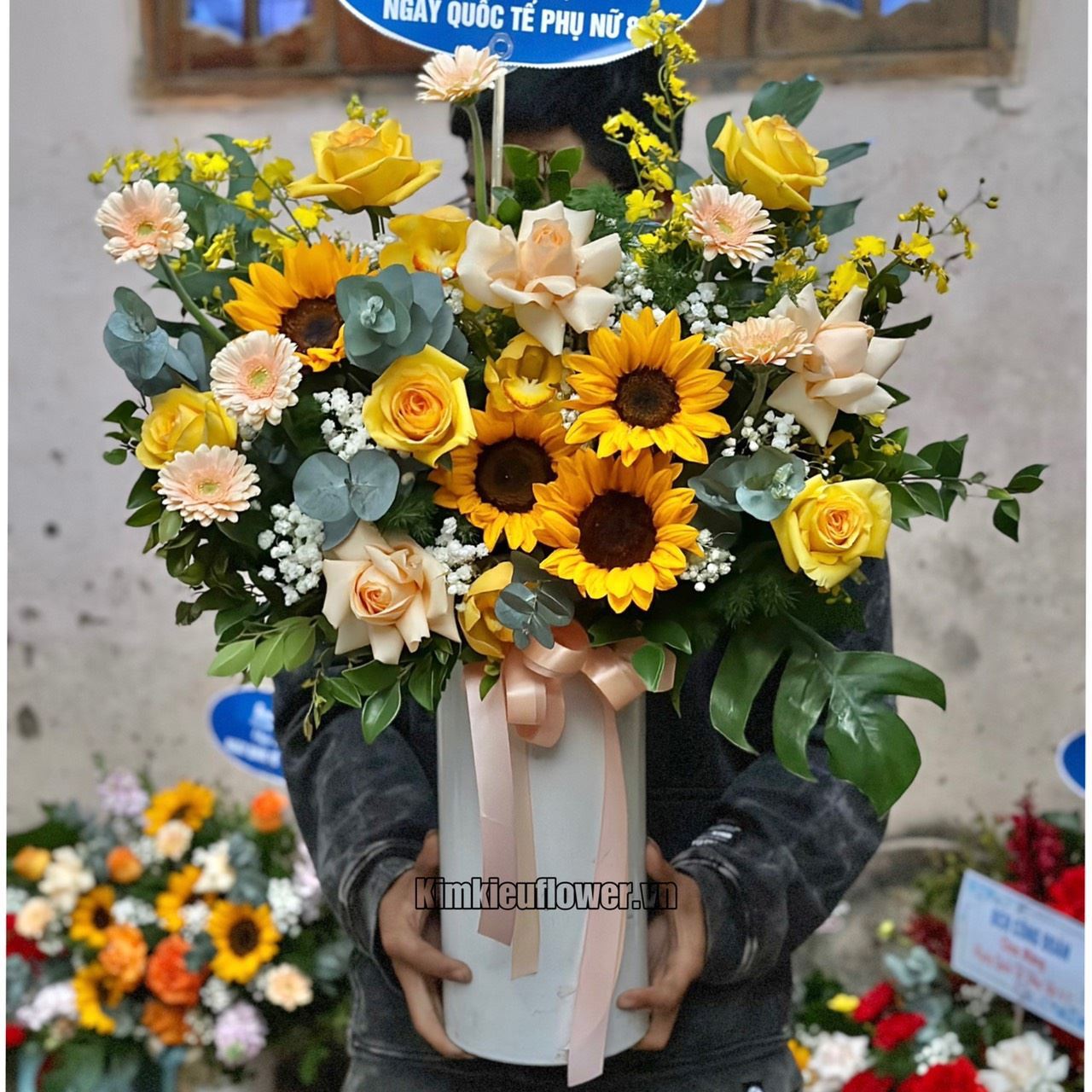 Mẫu BI236 gồm các loại hoa: + hoa hướng dương + hoa hồng vàng + hoa mỡ gà + lan vũ nữ + và các lá phụ khác - Liên hệ KIM KIỀU FLOWER để tư vấn thiết kế mẫu hoa theo yêu cầu bạn nhé!