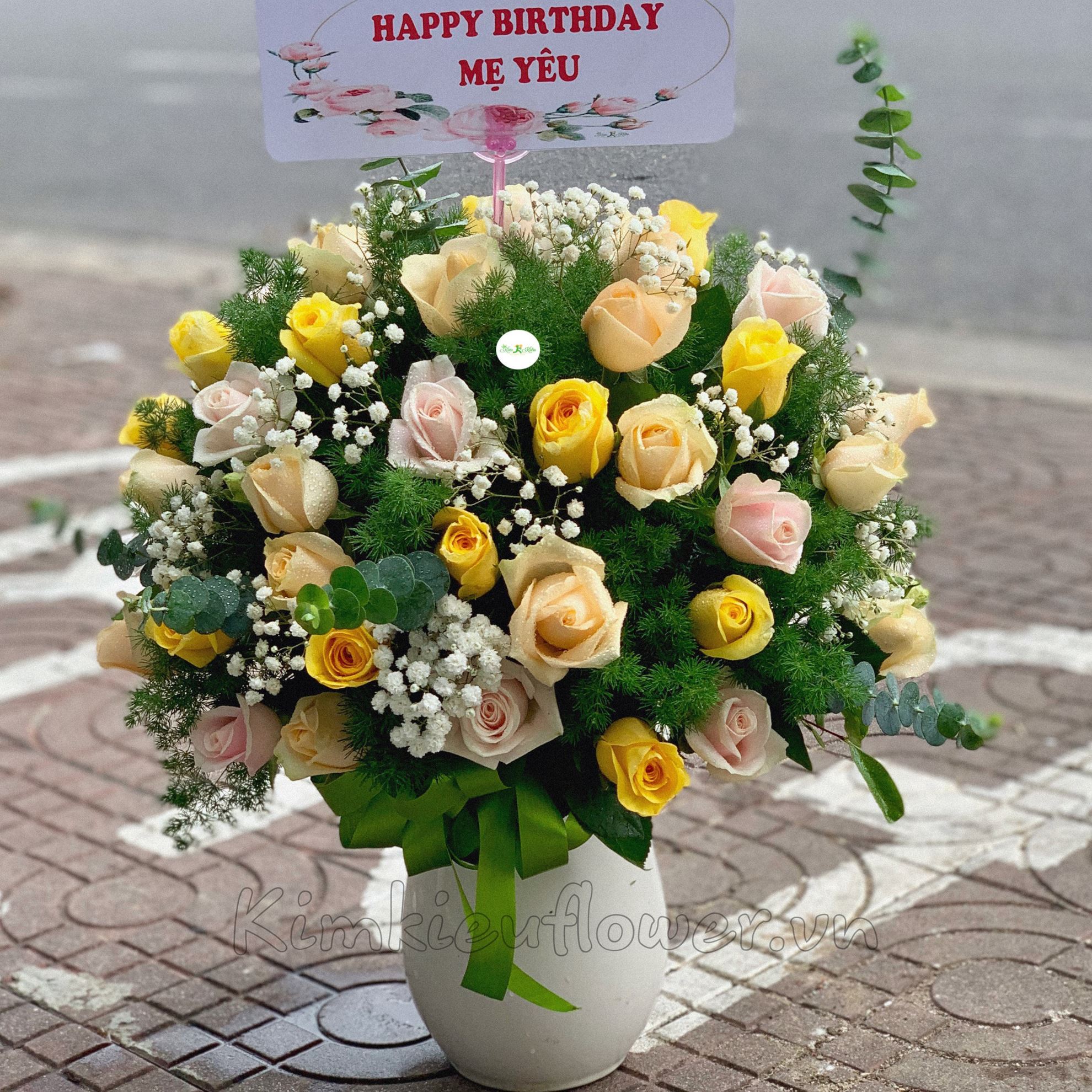 Mẫu BI40 gồm các loại hoa: + hoa hồng vàng + hoa hồng kem + và các hoa,lá phụ khác - Liên hệ KIM KIỀU FLOWER để tư vấn thiết kế mẫu hoa theo yêu cầu bạn nhé!