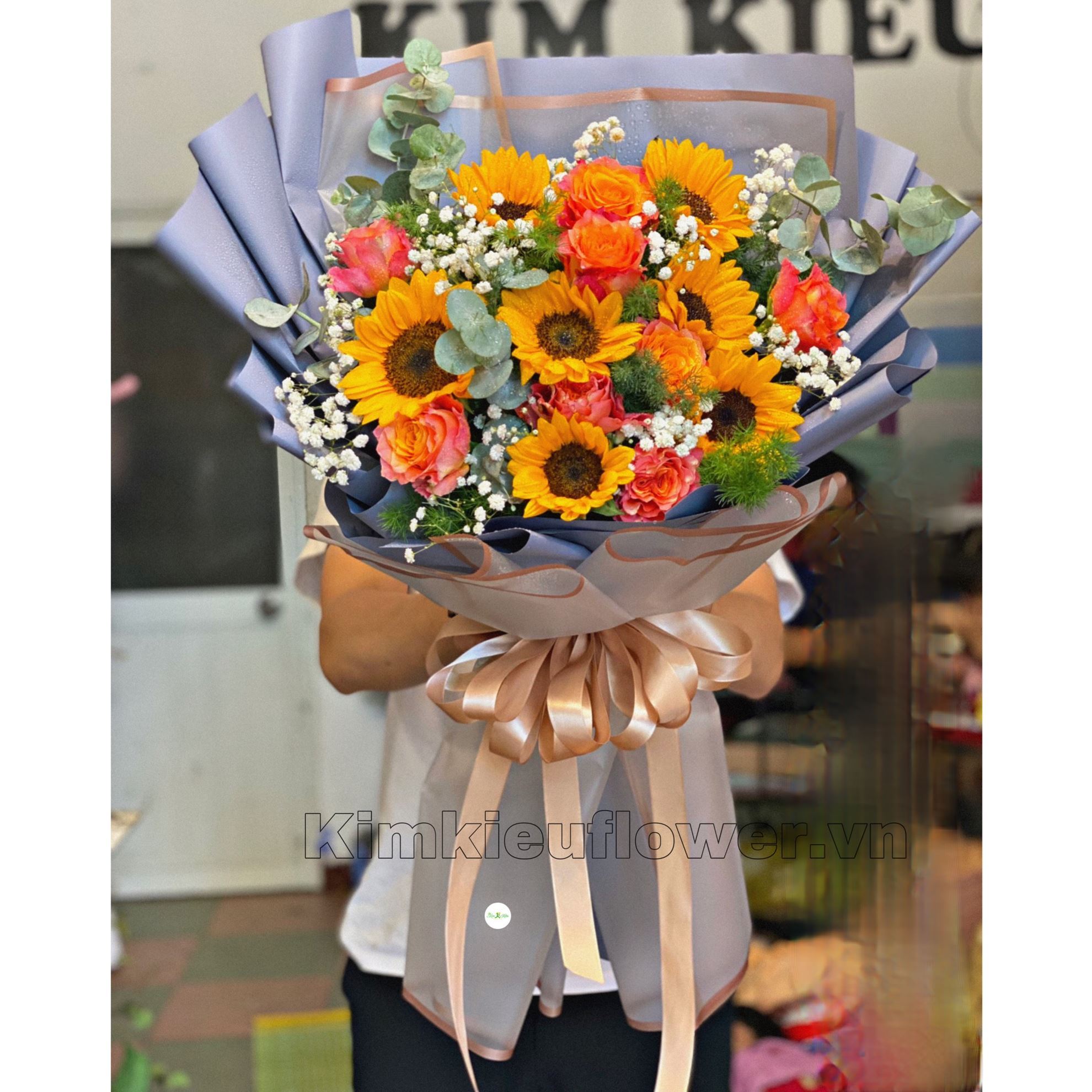 Mẫu HB316 gồm các loại hoa: + 7 hoa hướng dương + 8 hồng cam spirit và các lá phụ khác - Liên hệ KIM KIỀU FLOWER để tư vấn thiết kế mẫu hoa theo yêu cầu bạn nhé!