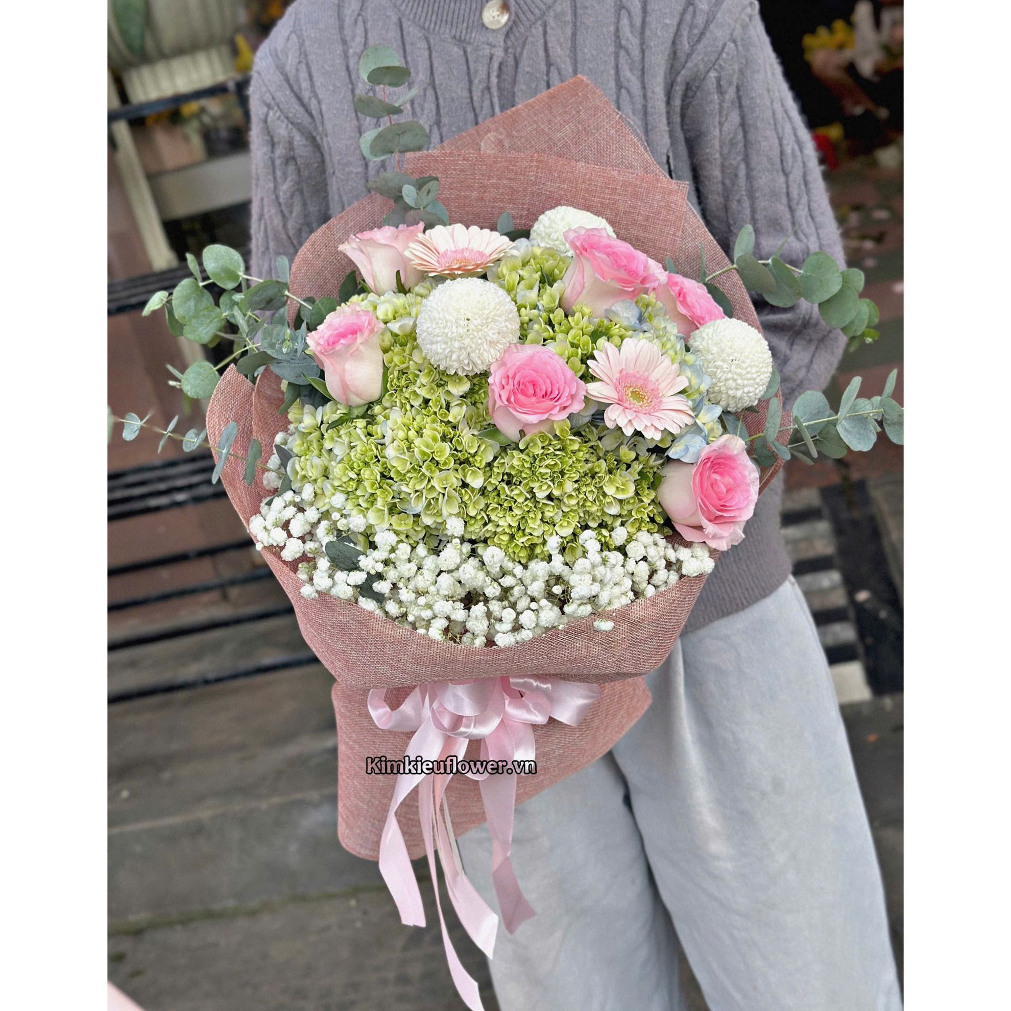 Mẫu HB840 gồm các loại hoa: + Cẩm tú cầu + 6 hồng lạc thần + 2 đồng tiền nhí hồng + 2 pingpong trắng + và các lá phụ khác - Liên hệ KIM KIỀU FLOWER để tư vấn thiết kế mẫu hoa theo yêu cầu bạn nhé!