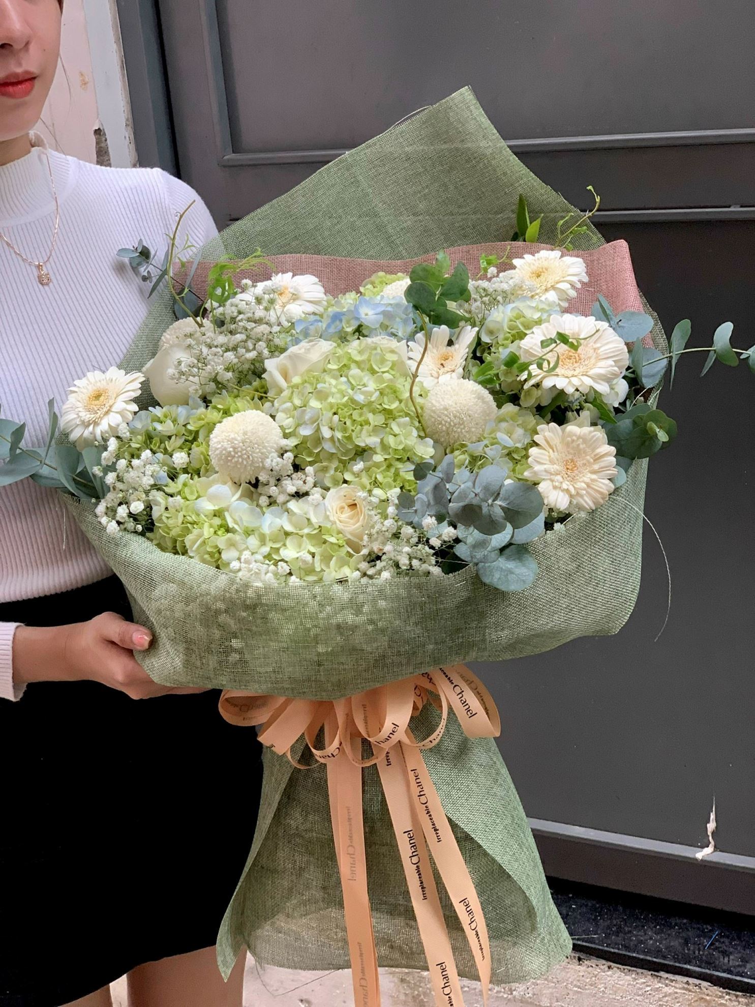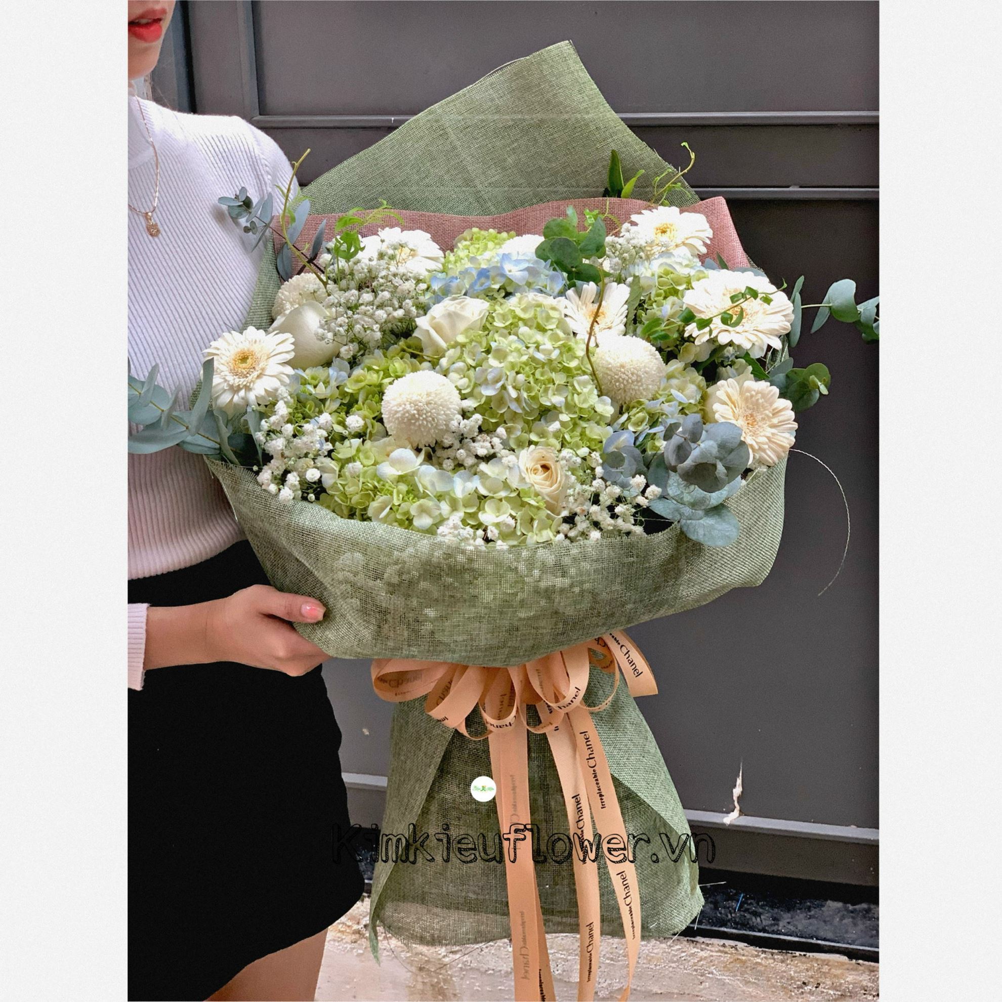 Mẫu HB381 gồm các loại hoa: + hoa cẩm tú cầu + pingpong trắng + đồng tiền trắng + và các lá phụ khác - Liên hệ KIM KIỀU FLOWER để tư vấn thiết kế mẫu hoa theo yêu cầu bạn nhé!