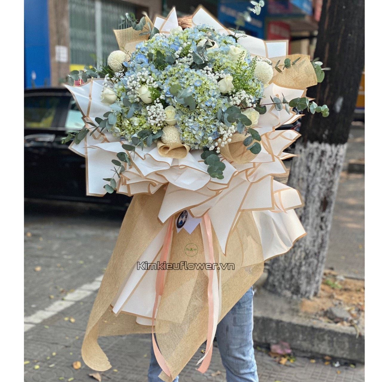 Mẫu HB430 gồm các loại hoa: + cẩm tú cầu + hoa hồng trắng + pingpong trắng + và các lá phụ khác - Liên hệ KIM KIỀU FLOWER để tư vấn thiết kế mẫu hoa theo yêu cầu bạn nhé!