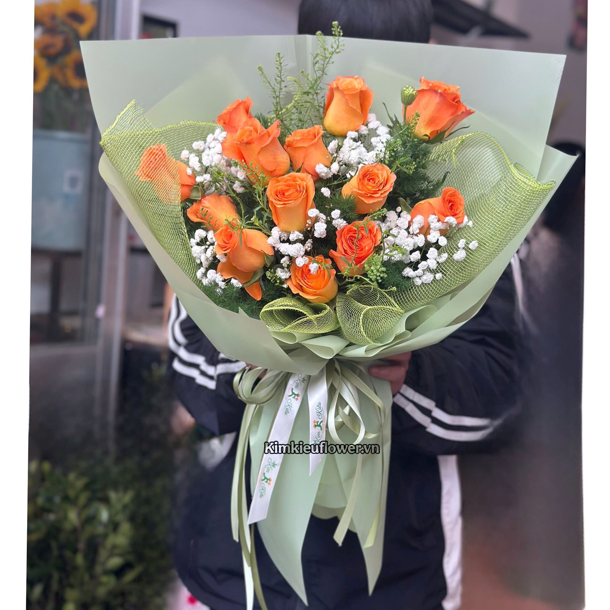 Mẫu HB973 gồm các loại hoa: + 13 hồng cam quốc vương + và các lá phụ khác - Liên hệ KIM KIỀU FLOWER để tư vấn thiết kế mẫu hoa theo yêu cầu bạn nhé!
