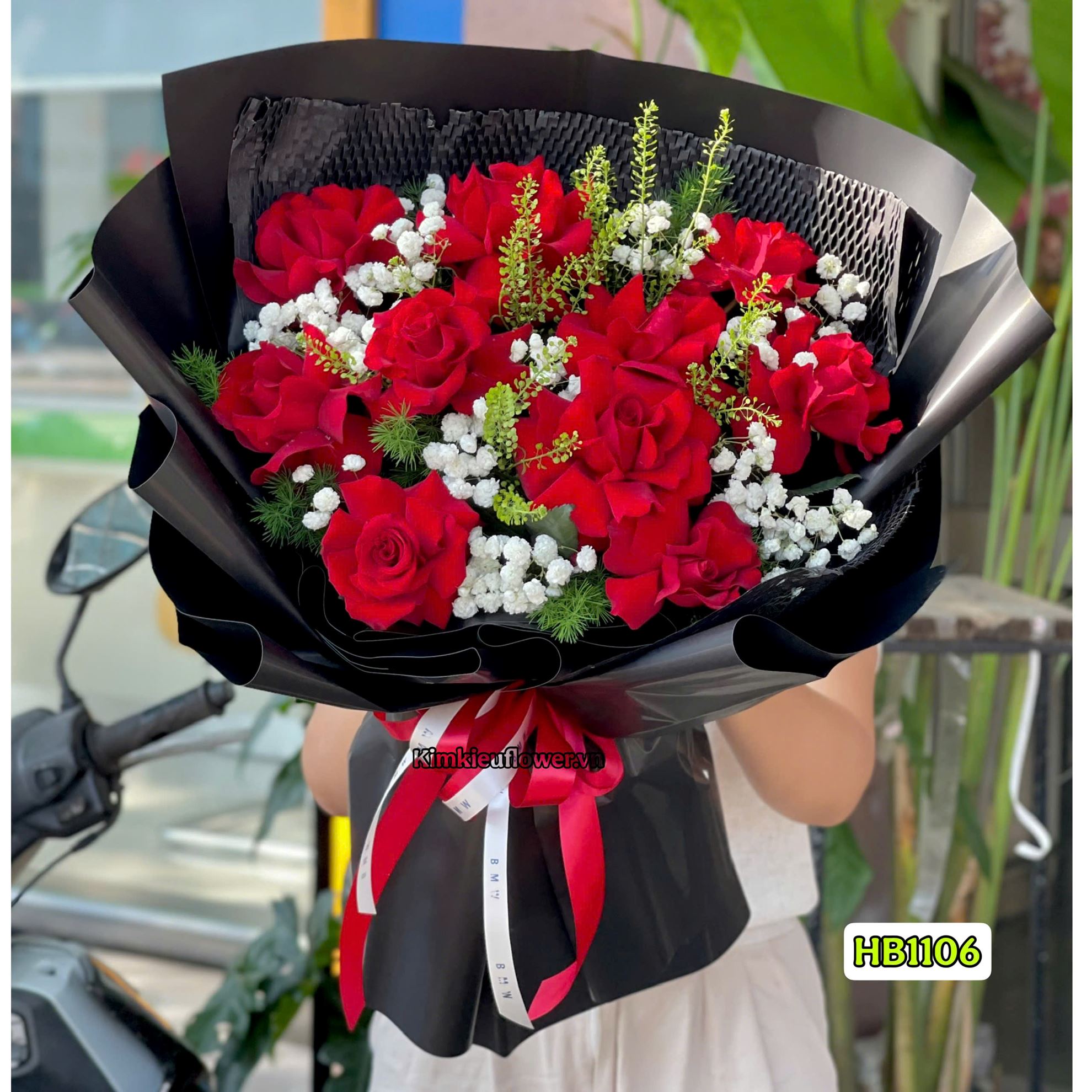 Mẫu HT1106 gồm các loại hoa: + 10 hồng đỏ + và các lá phụ khác - Liên hệ KIM KIỀU FLOWER để tư vấn thiết kế mẫu hoa theo yêu cầu bạn nhé!
