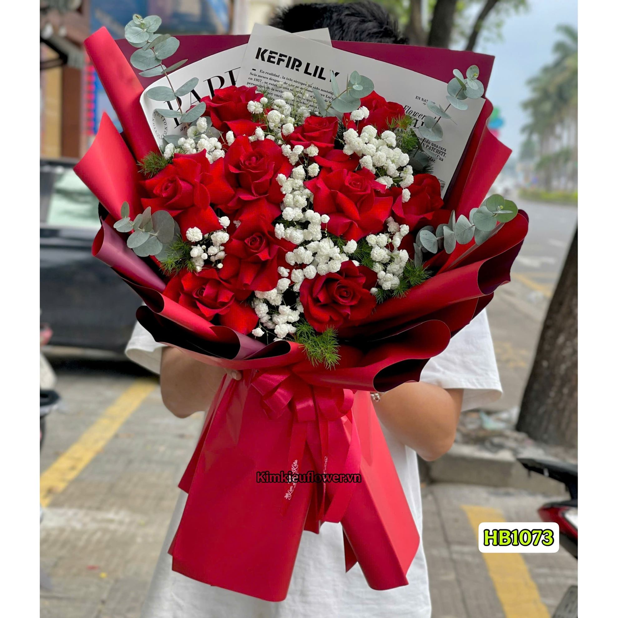 Mẫu HB1073 gồm các loại hoa: + 10 hồng đỏ eku + lá bạc + và các lá phụ khác - Liên hệ KIM KIỀU FLOWER để tư vấn thiết kế mẫu hoa theo yêu cầu bạn nhé!