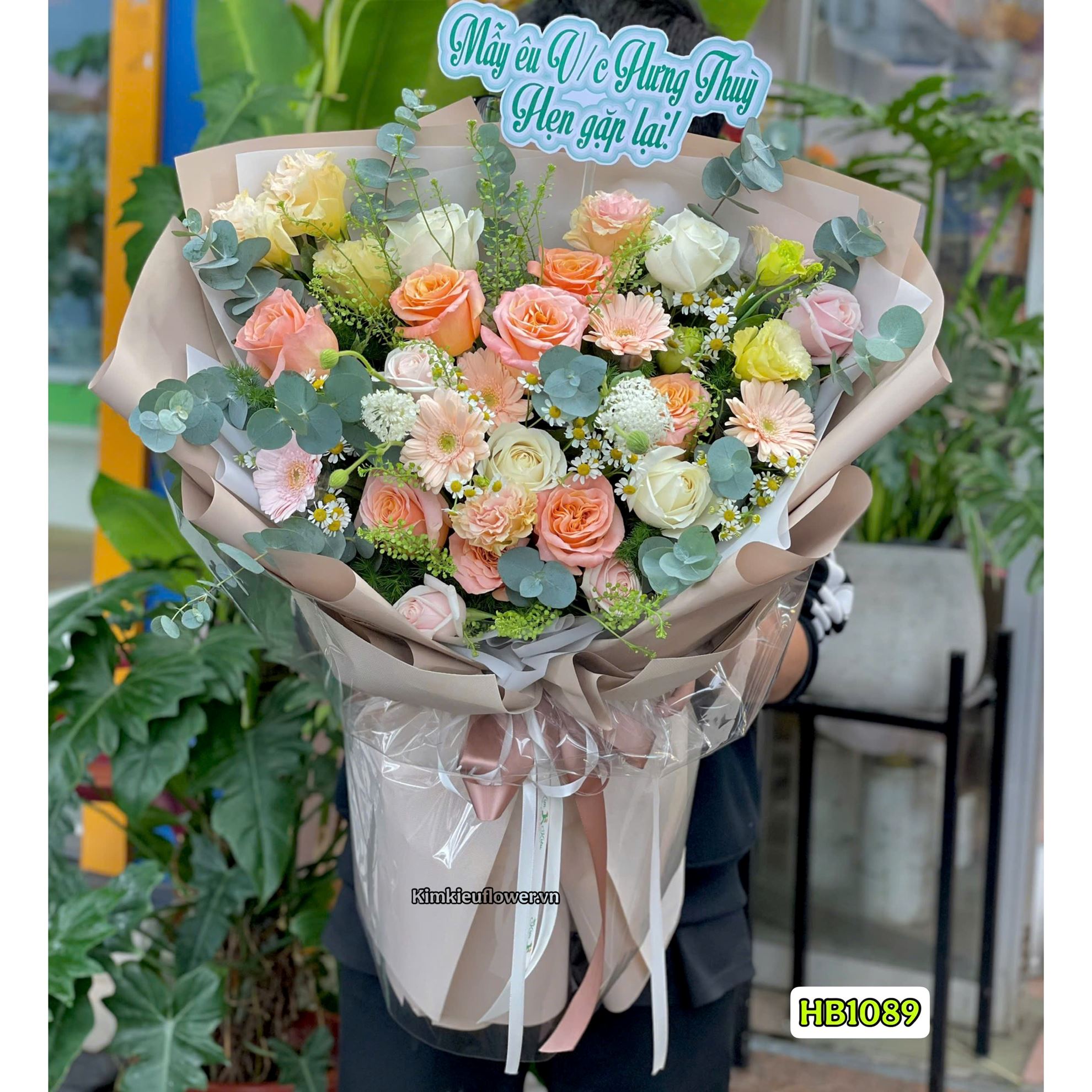 Mẫu HB1089 gồm các loại hoa: + 8 hoa hồng shimmer + 4 cát tường carot (2 đơn, 2 cành) + 5 đồng tiền nhí (2 kem,3 carot) + 4 hoa hồng kem + 4 hoa hồng trắng + và các hoa,lá phụ khác - Liên hệ KIM KIỀU FLOWER để tư vấn thiết kế mẫu hoa theo yêu cầu bạn nhé!