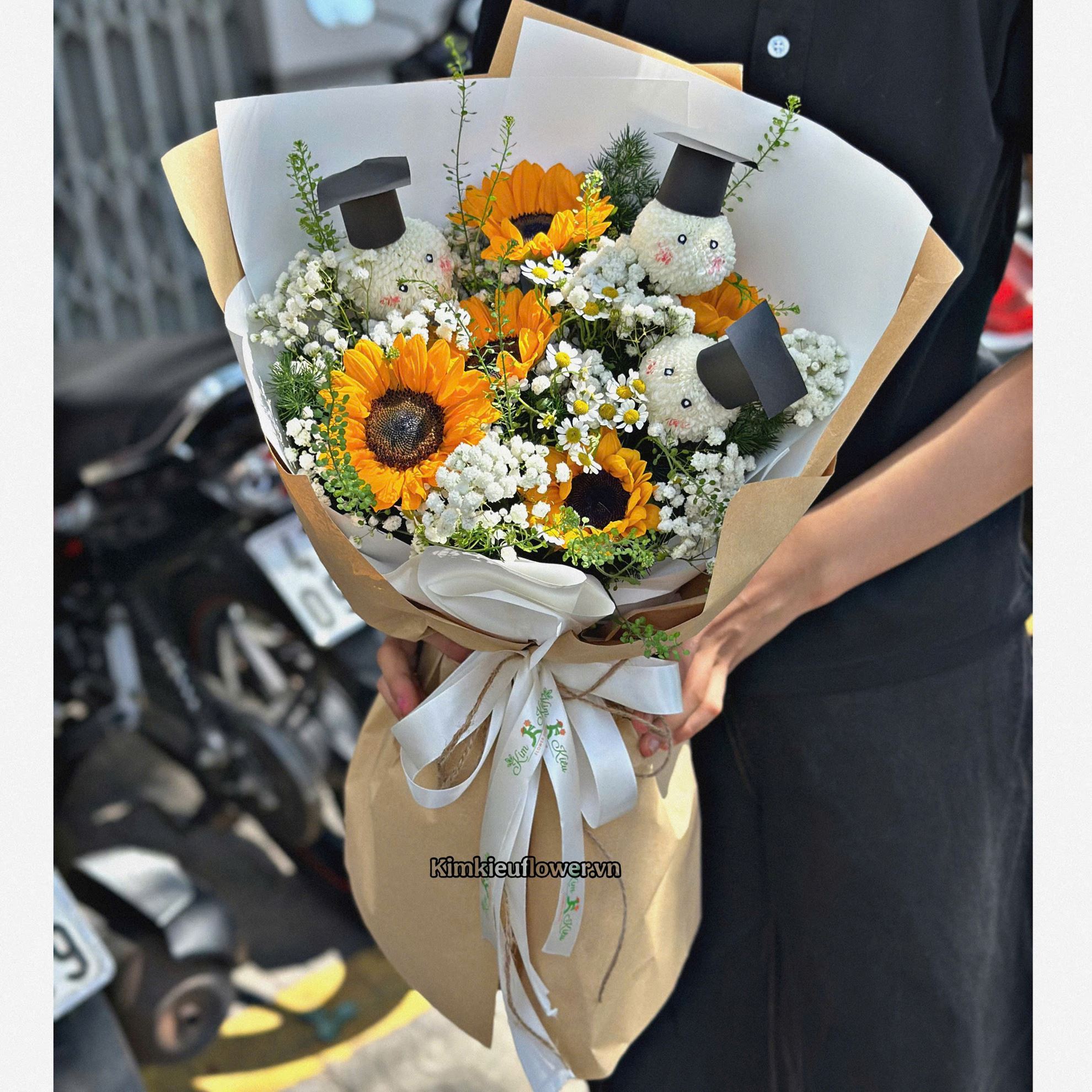 Mẫu HB1052 gồm các loại hoa: + 5 hướng dương + 3 cúc pingpong + và các lá phụ khác - Liên hệ KIM KIỀU FLOWER để tư vấn thiết kế mẫu hoa theo yêu cầu bạn nhé!