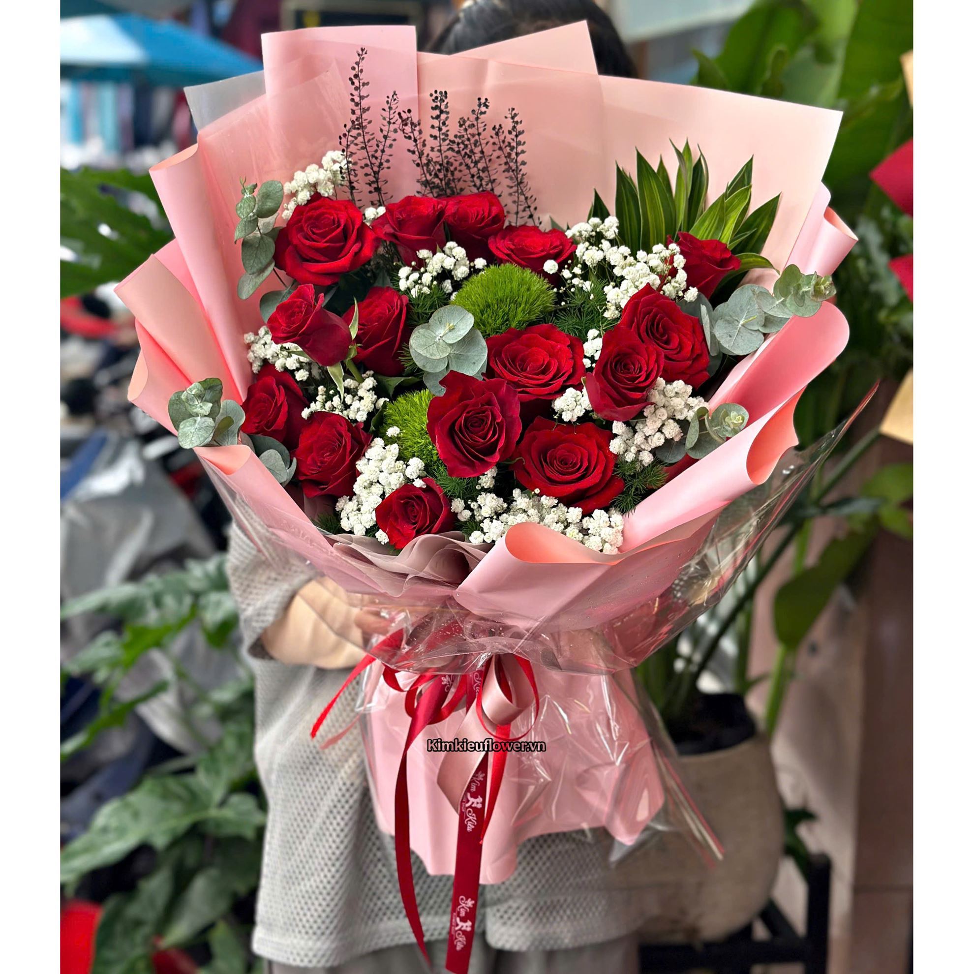 Mẫu HB1047 gồm các loại hoa:\ + 15 hồng đỏ eku + 2 green wicky + và các lá phụ khác - Liên hệ KIM KIỀU FLOWER để tư vấn thiết kế mẫu hoa theo yêu cầu bạn nhé!