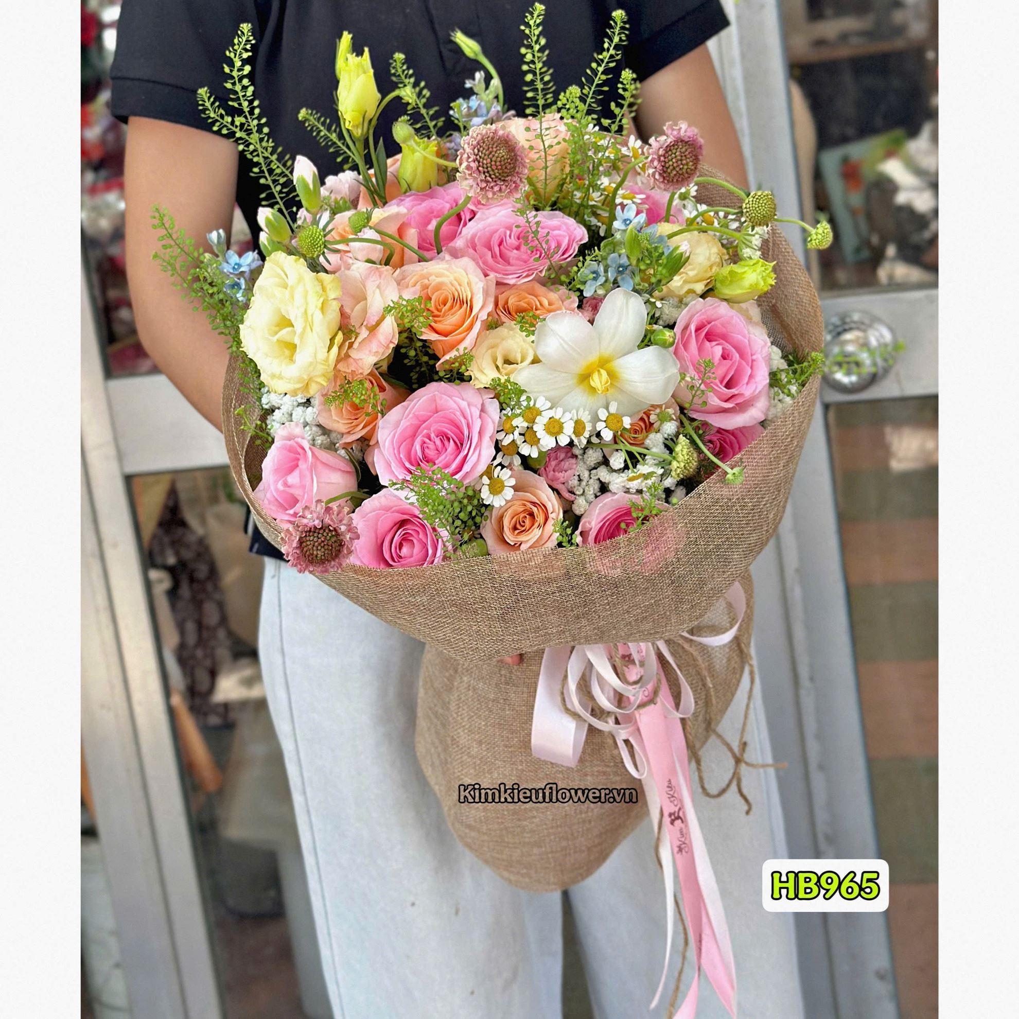 Mẫu HB965 gồm các loại hoa: + 10 hoa hồng lạc thần + 9 hoa hồng shimmer + 1 hoa tulip trắng + cát tường cam + scabiosa hồng + cẩm chướng hồng chùm + hoa sao xanh + và các lá phụ khác - Liên hệ KIM KIỀU FLOWER để tư vấn thiết kế mẫu hoa theo yêu cầu bạn nhé!