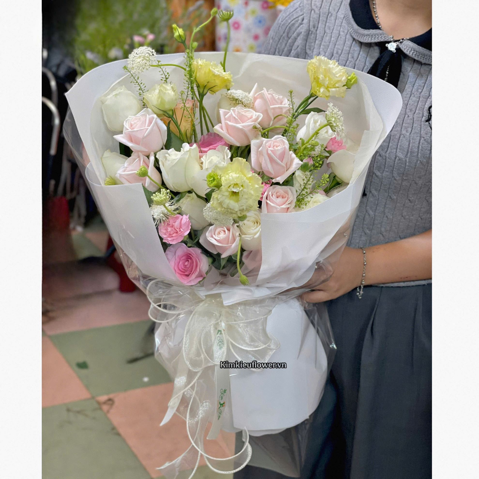 Mẫu HB1048 gồm các loại hoa: + 7 hồng kem + 9 hồng trắng + 2 lạc thần + cát tường + và các lá phụ khác - Liên hệ KIM KIỀU FLOWER để tư vấn thiết kế mẫu hoa theo yêu cầu bạn nhé!
