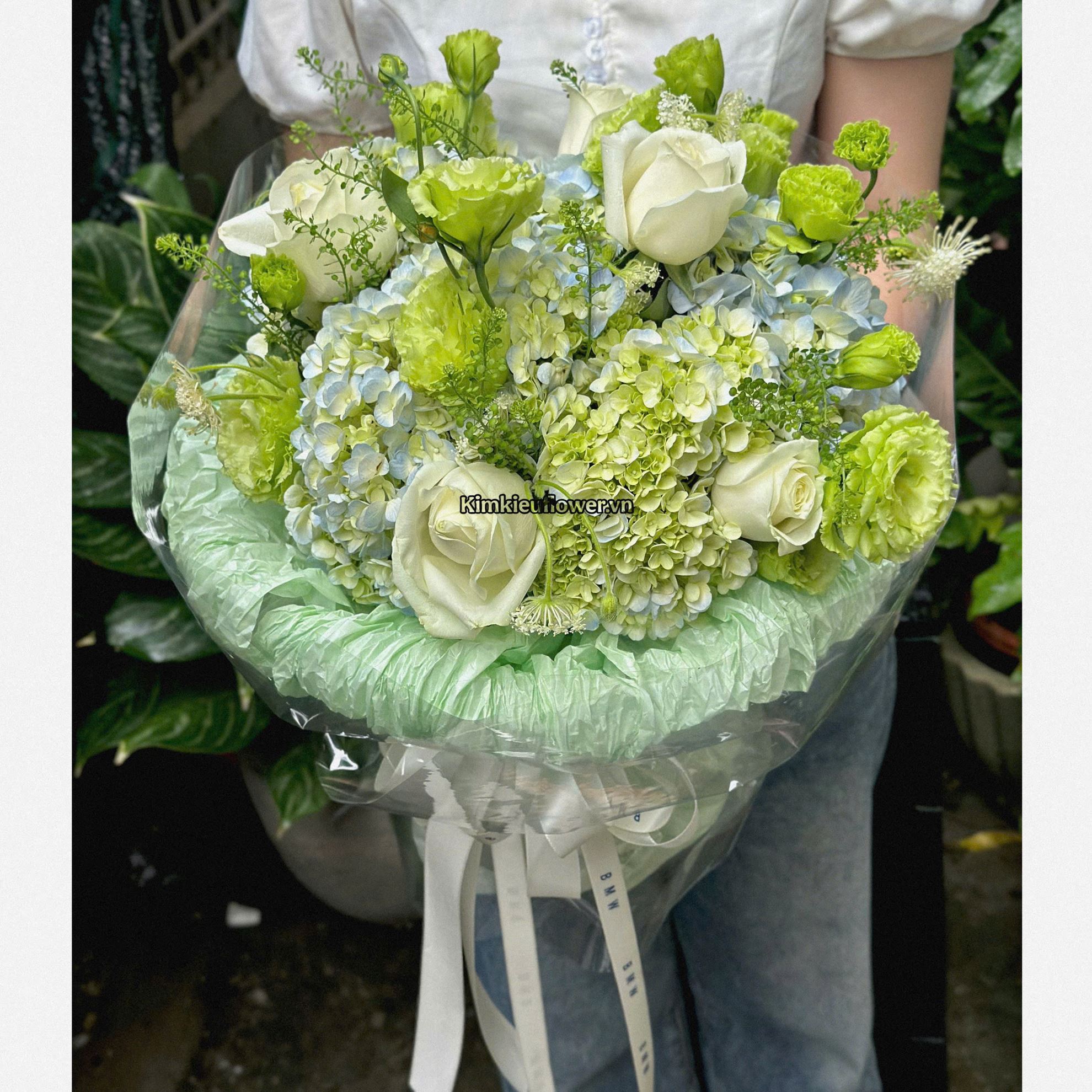 Mẫu HB1026 gồm các loại hoa: + 5 hồng trắng + 6 cành cát tường xanh + 3 cẩm tú cầu + và các lá phụ khác - Liên hệ KIM KIỀU FLOWER để tư vấn thiết kế mẫu hoa theo yêu cầu bạn nhé!