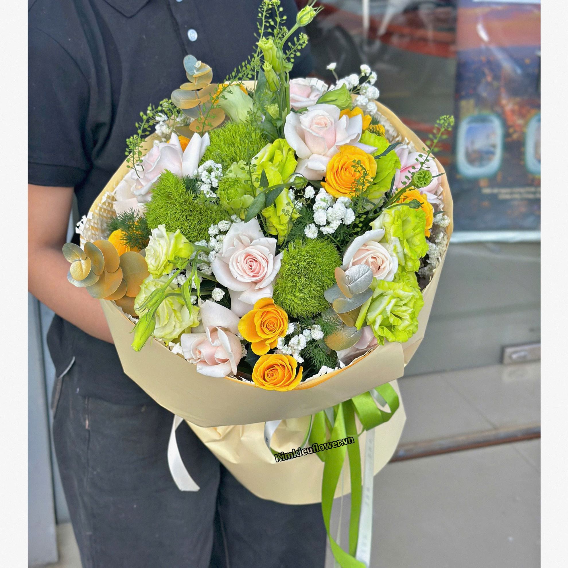 Mẫu HB1058 gồm các loại hoa: + 8 hồng kem + 8 hồng vàng + 3 green wicky + 4 cành cát tường xanh + và các lá phụ khác - Liên hệ KIM KIỀU FLOWER để tư vấn thiết kế mẫu hoa theo yêu cầu bạn nhé!