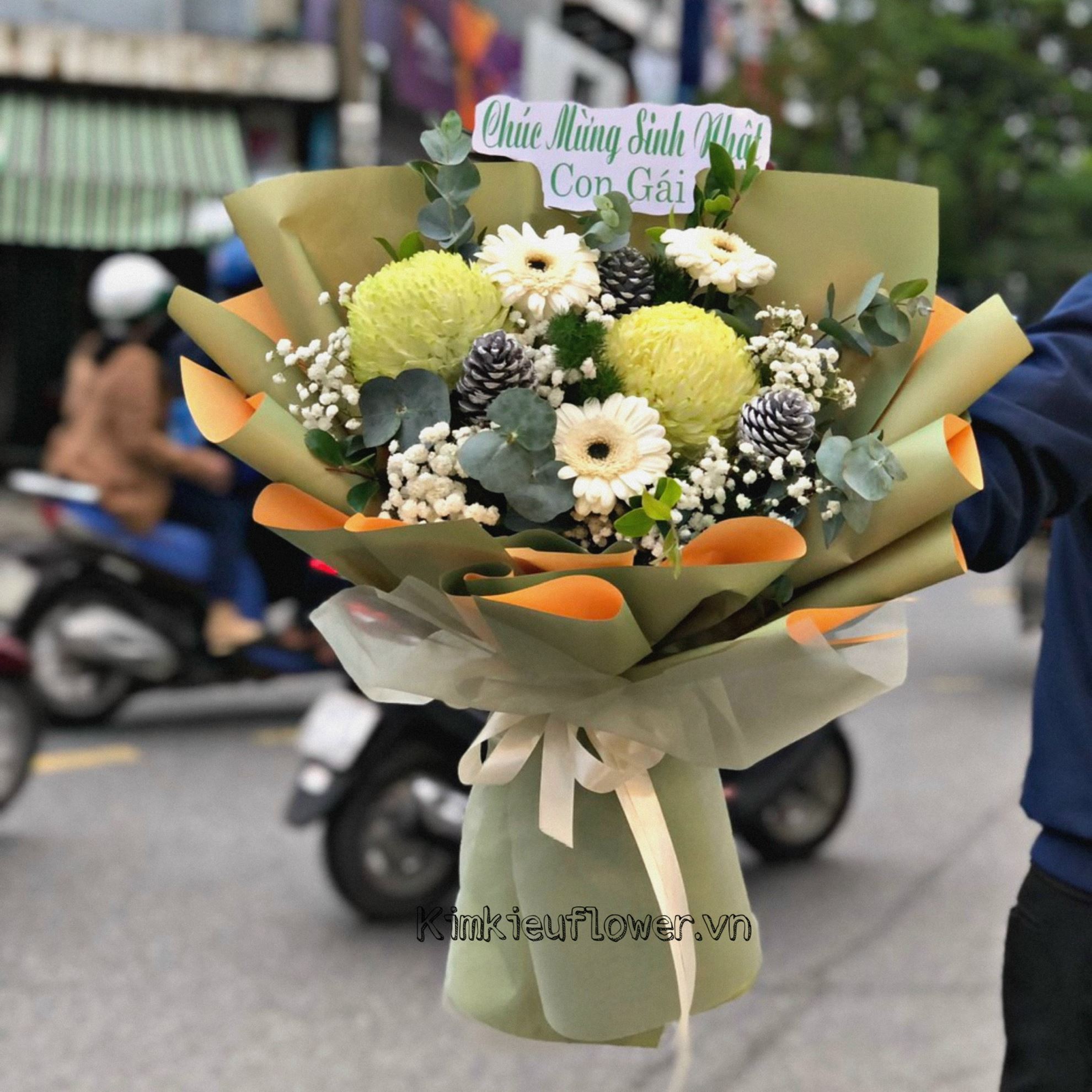 Mẫu HB401 gồm các loại hoa: + 2 cúc mẫu đơn xanh + đồng tiền nhí + và các lá phụ khác - Liên hệ KIM KIỀU FLOWER để tư vấn thiết kế mẫu hoa theo yêu cầu bạn nhé!