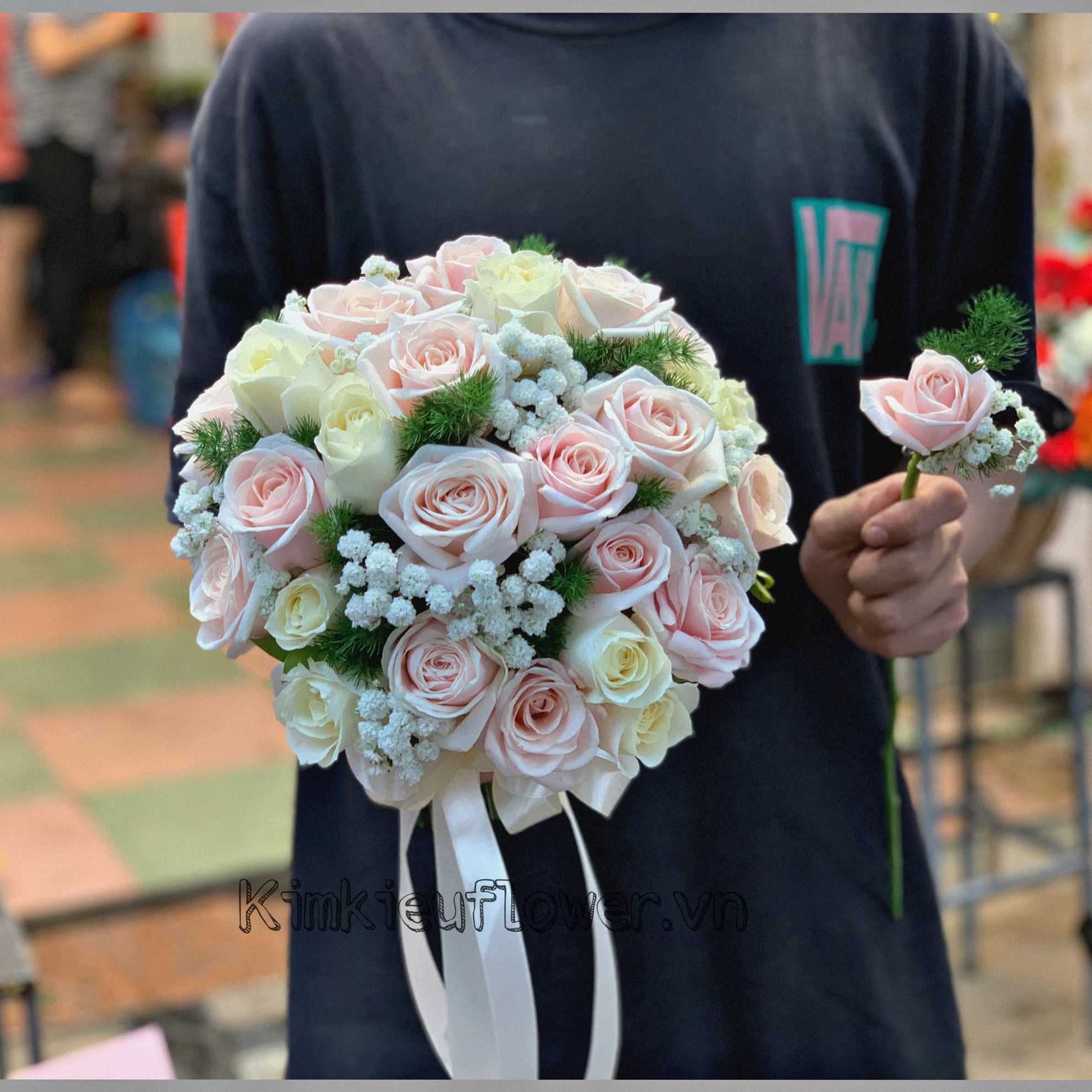 Mẫu HC11: Một chút sắc hồng lãng mạn, một chút sắc trắng tinh khôi hòa quyện lại tạo nên một bó hoa rất dễ thương. Bó hoa là điều tuyệt vời nhất cho các cô nàng yêu sắc hồng và theo đuổi phong cách sang trọng quí phái. - Mẫu HC11 gồm các loại hoa : + hoa hồng kem + hoa hồng trắng + và các hoa, lá phụ khác - Liên hệ KIM KIỀU FLOWER để tư vấn thiết kế mẫu hoa theo yêu cầu bạn nhé!