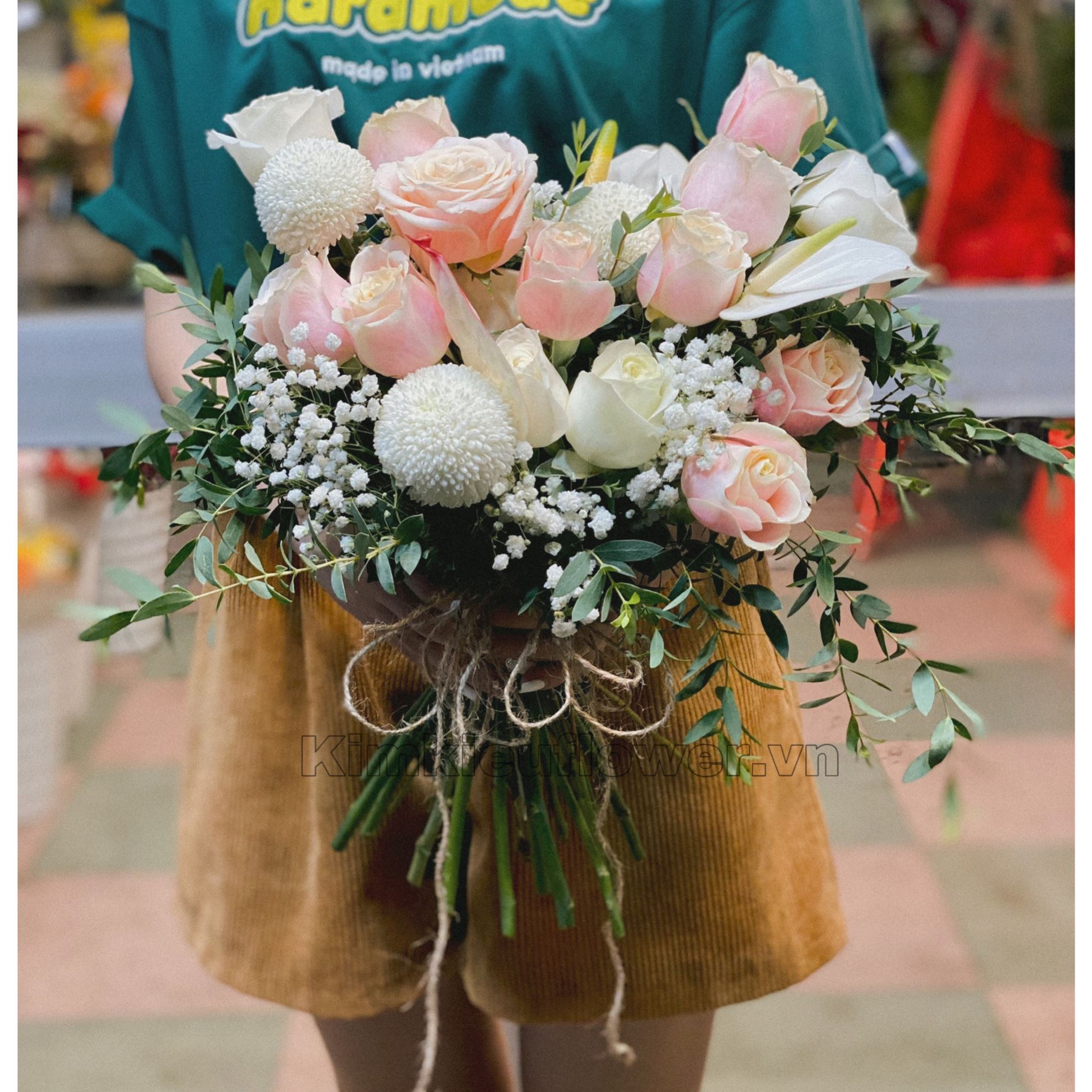 Mẫu HC52 gồm các loại hoa: + hoa hồng wlen + pingpong trắng + hồng môn trắng + hoa hồng trắng + và các lá phụ khác- Liên hệ KIM KIỀU FLOWER để tư vấn thiết kế mẫu hoa theo yêu cầu bạn nhé!