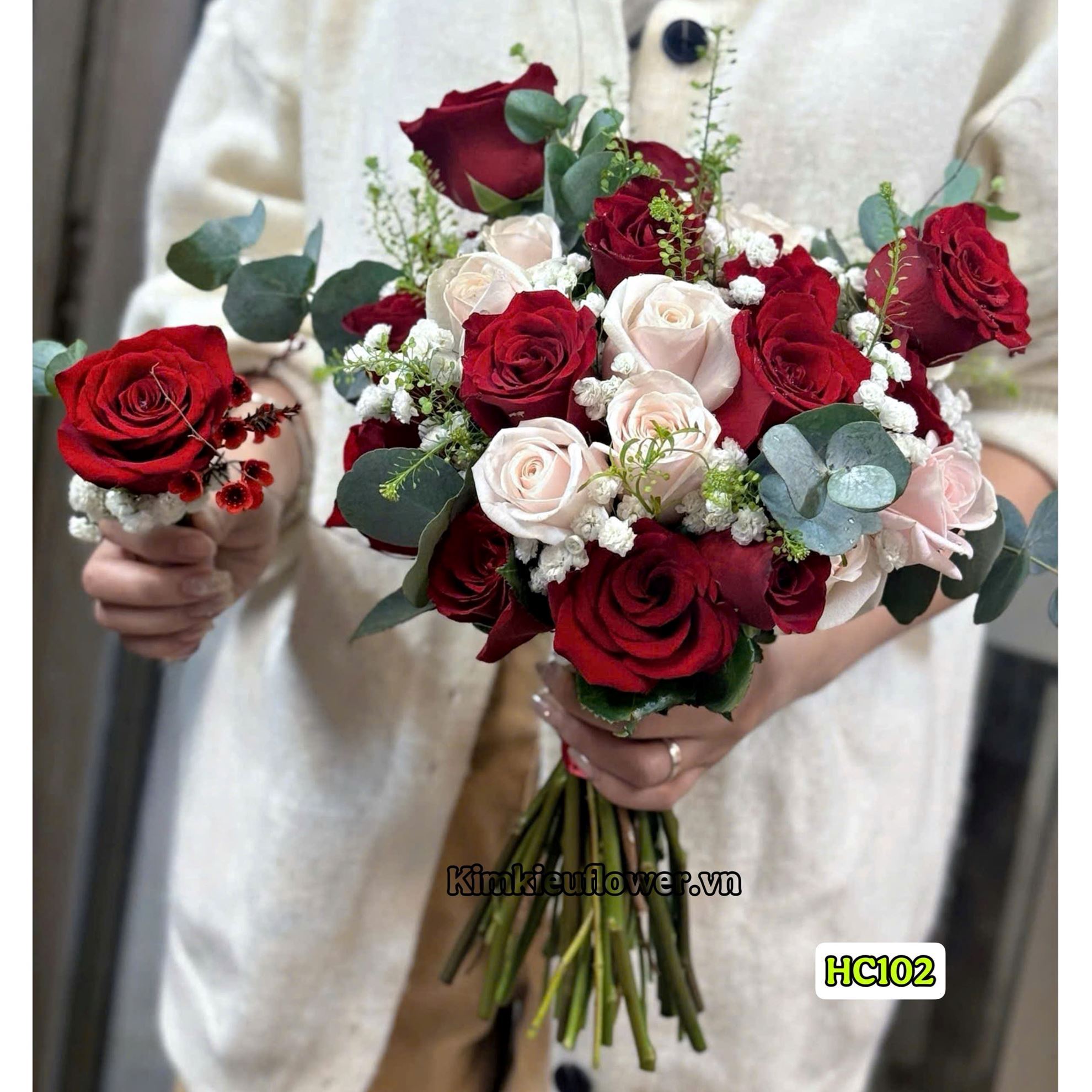 Mẫu HC102 gồm các loại hoa: + Hoa hồng đỏ eku + Hoa hồng kem + và các lá phụ khác - Liên hệ KIM KIỀU FLOWER để tư vấn thiết kế mẫu hoa theo yêu cầu bạn nhé!