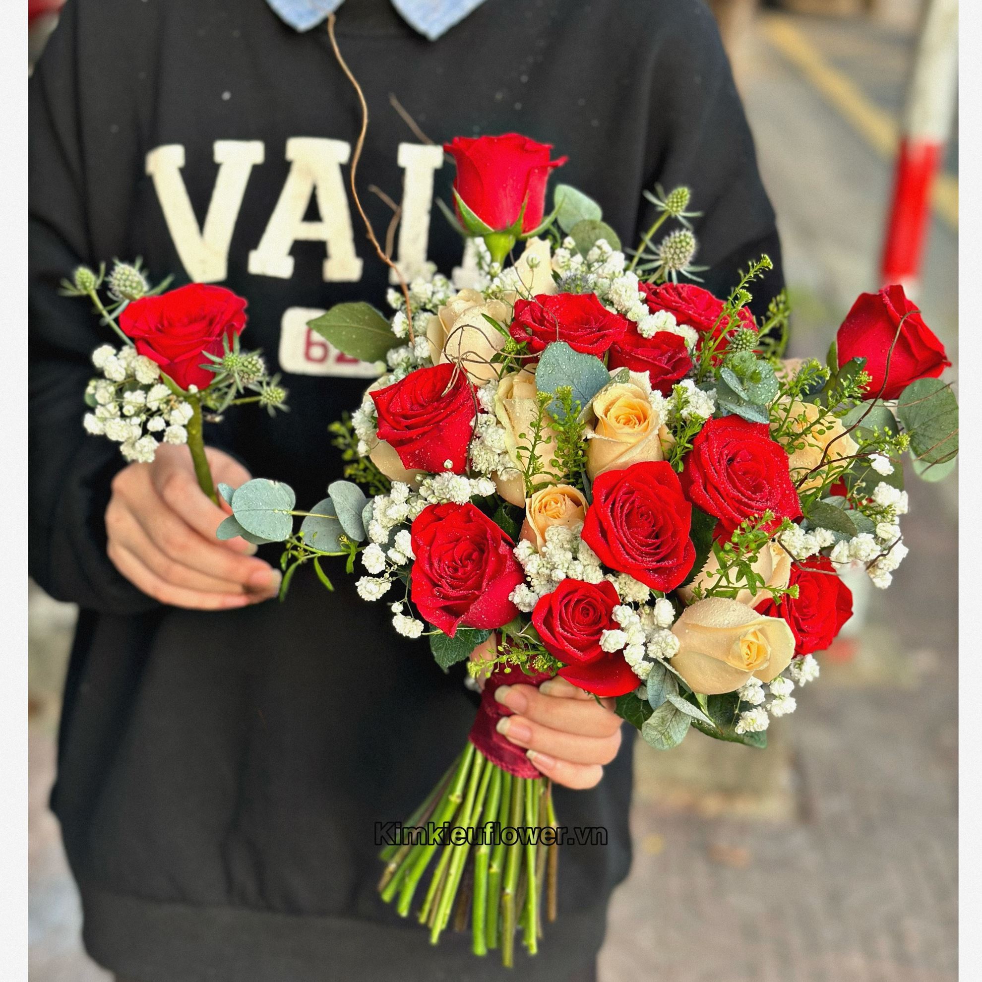 Mẫu HC83 gồm các loại hoa : + hoa hồng đỏ + hoa hồng mỡ gà + và các lá phụ khác- Liên hệ KIM KIỀU FLOWER để tư vấn thiết kế mẫu hoa theo yêu cầu bạn nhé!