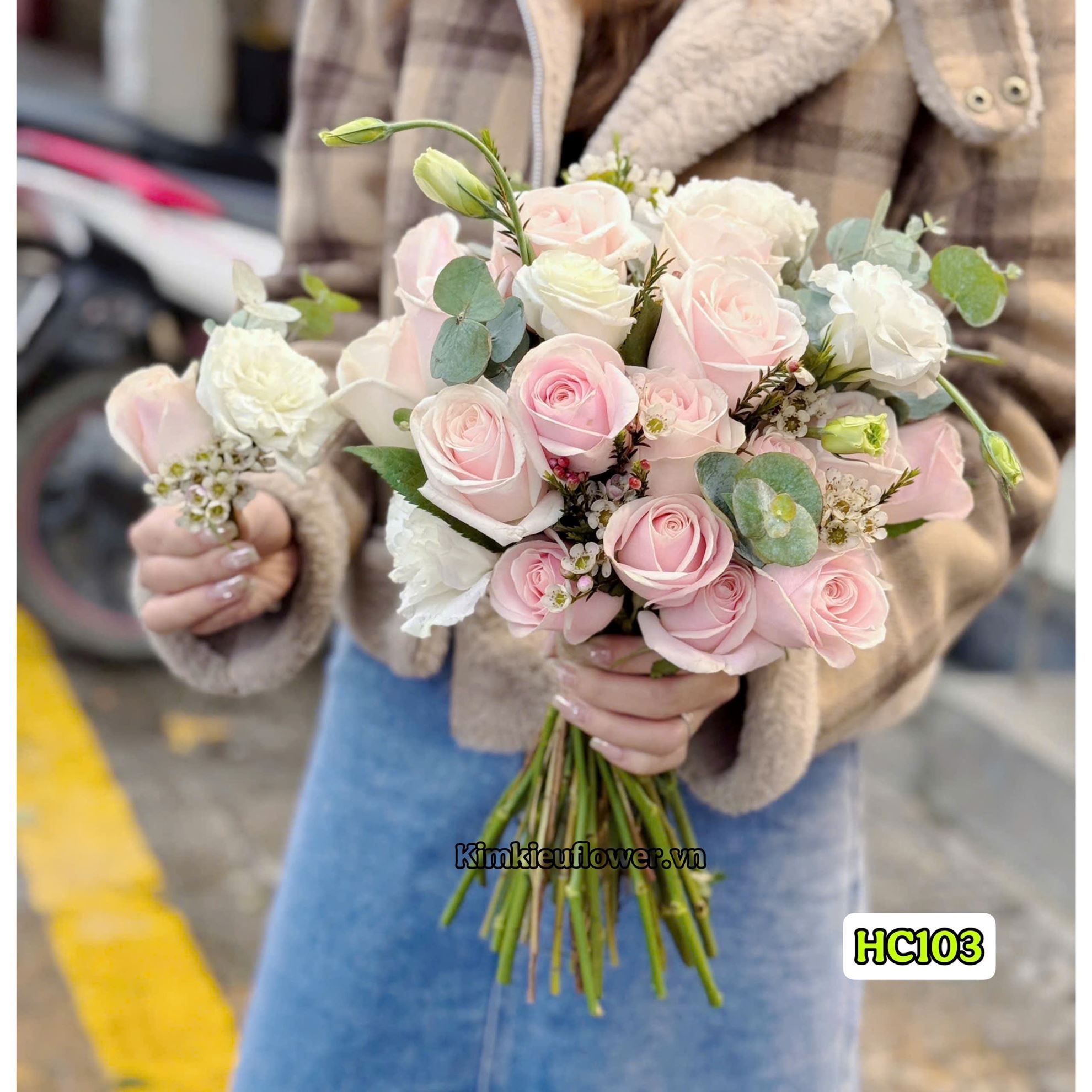 Mẫu HC103 gồm các loại hoa: + Hoa hồng kem + Cát tường trắng + và các lá phụ khác - Liên hệ KIM KIỀU FLOWER để tư vấn thiết kế mẫu hoa theo yêu cầu bạn nhé!