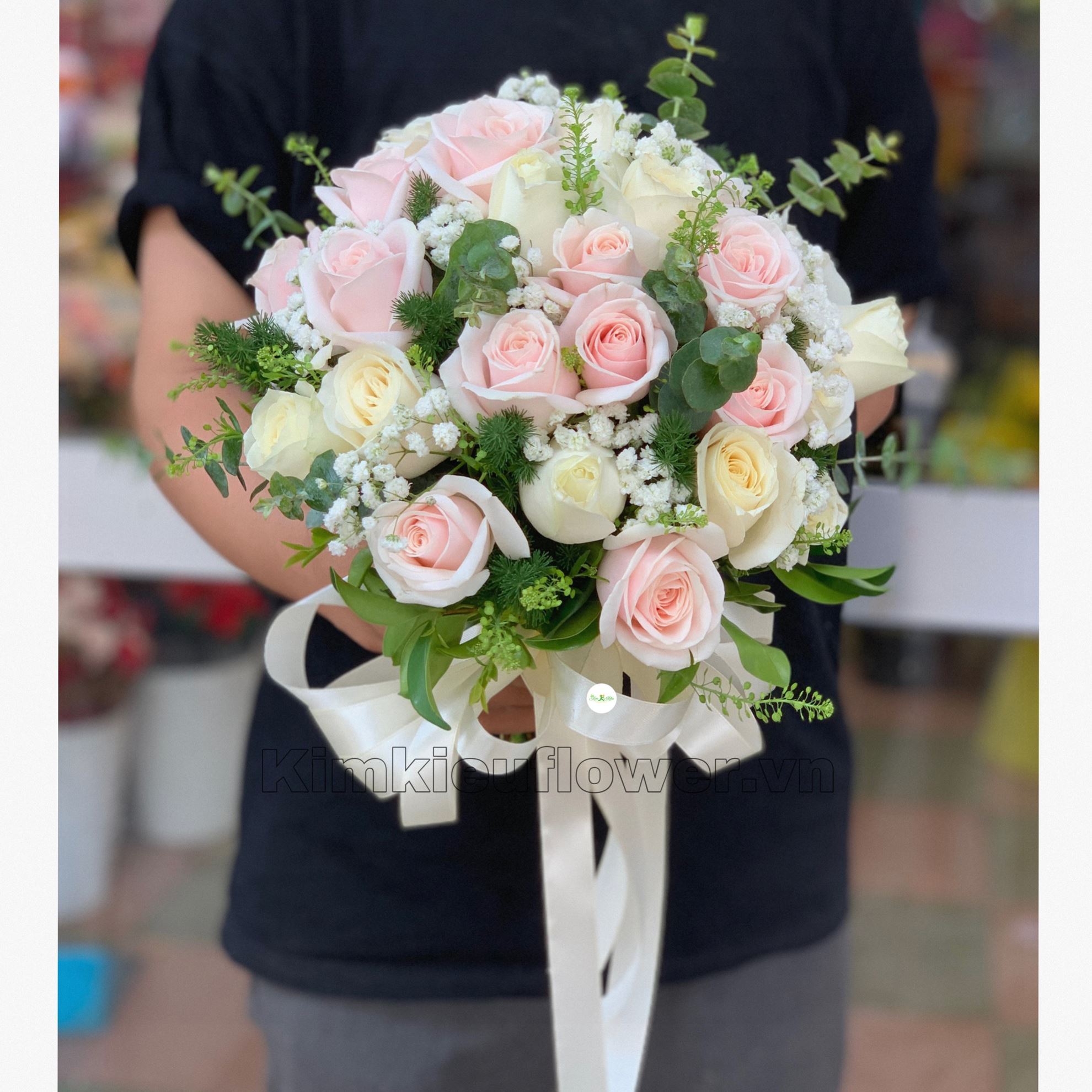 Bó hoa cưới hồng trắng, hồng kem - HC51