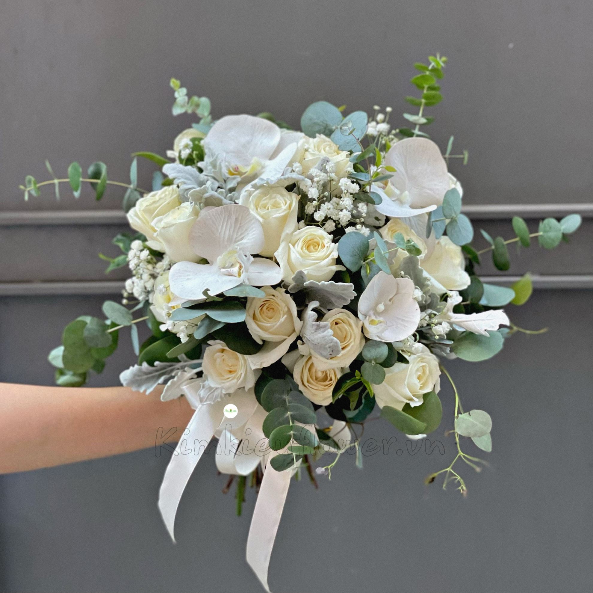Mẫu HC36 gồm các loại hoa : + hoa hồng trắng + lan hồ điệp trắng + và các lá phụ khác- Liên hệ KIM KIỀU FLOWER để tư vấn thiết kế mẫu hoa theo yêu cầu bạn nhé!