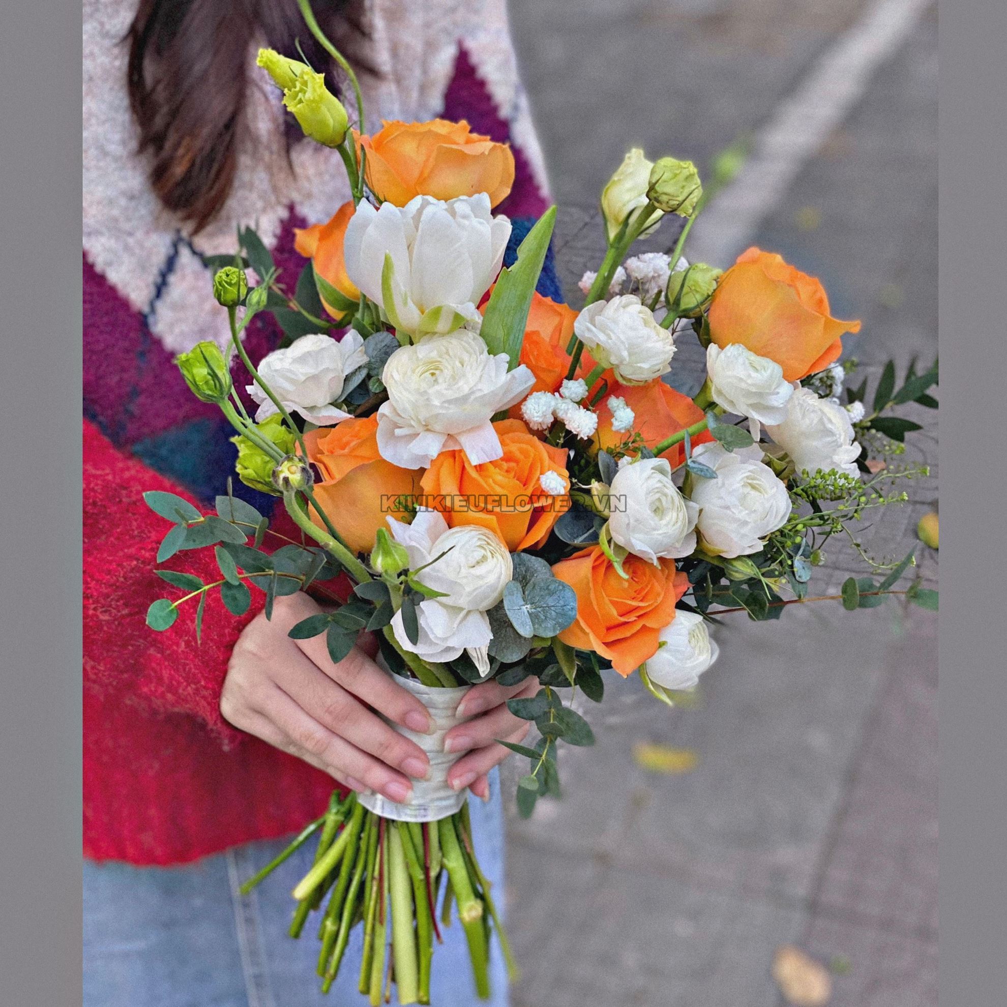 Mẫu HC88 gồm các loại hoa: + hoa mao lương trắng + hoa hồng cam quốc vương + tuip trắng + và các lá phụ khác- Liên hệ KIM KIỀU FLOWER để tư vấn thiết kế mẫu hoa theo yêu cầu bạn nhé!